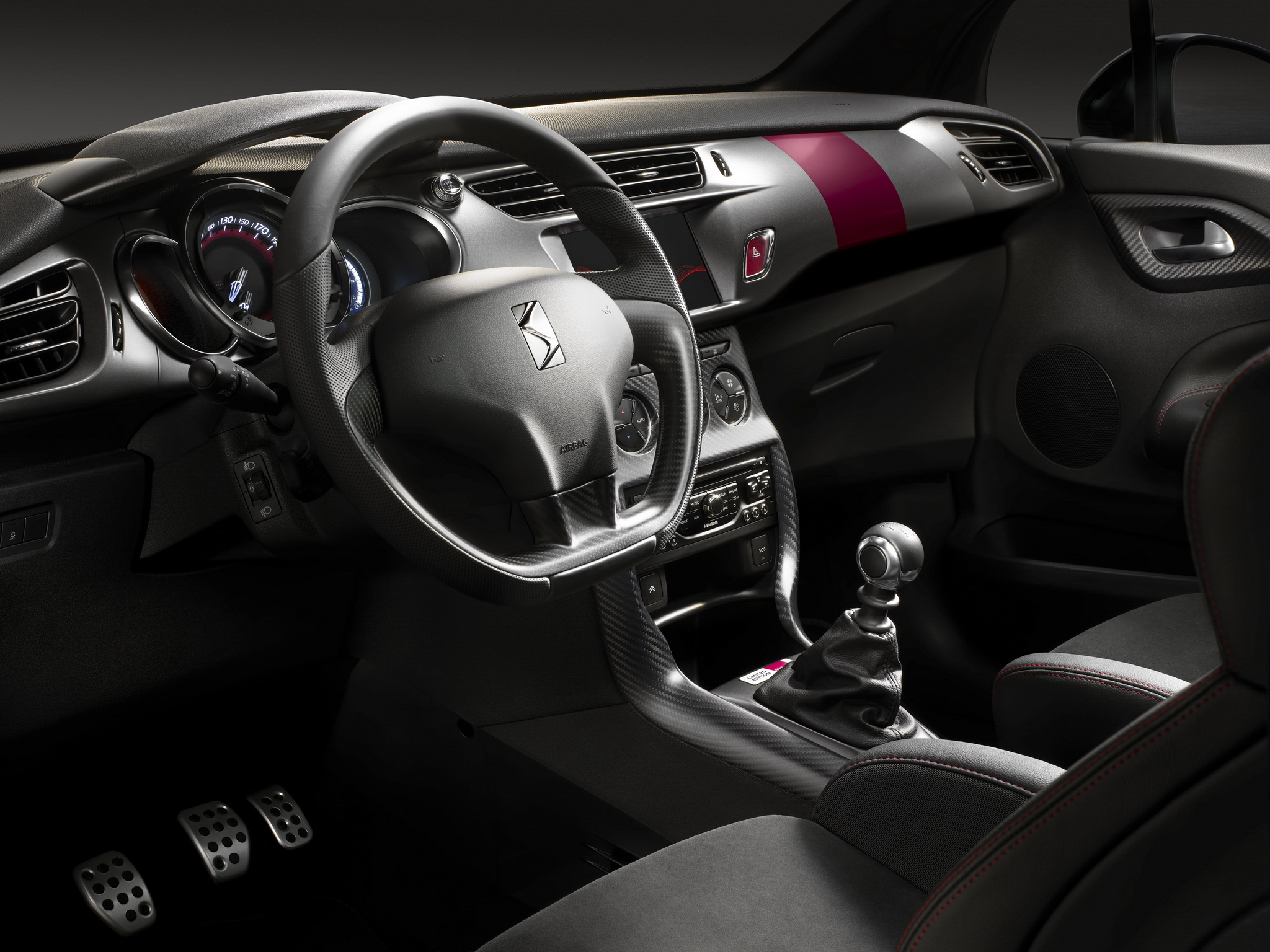 Description: A car dashboard with a steering wheel and a dash board with a red stripe on it and a black leather seat.