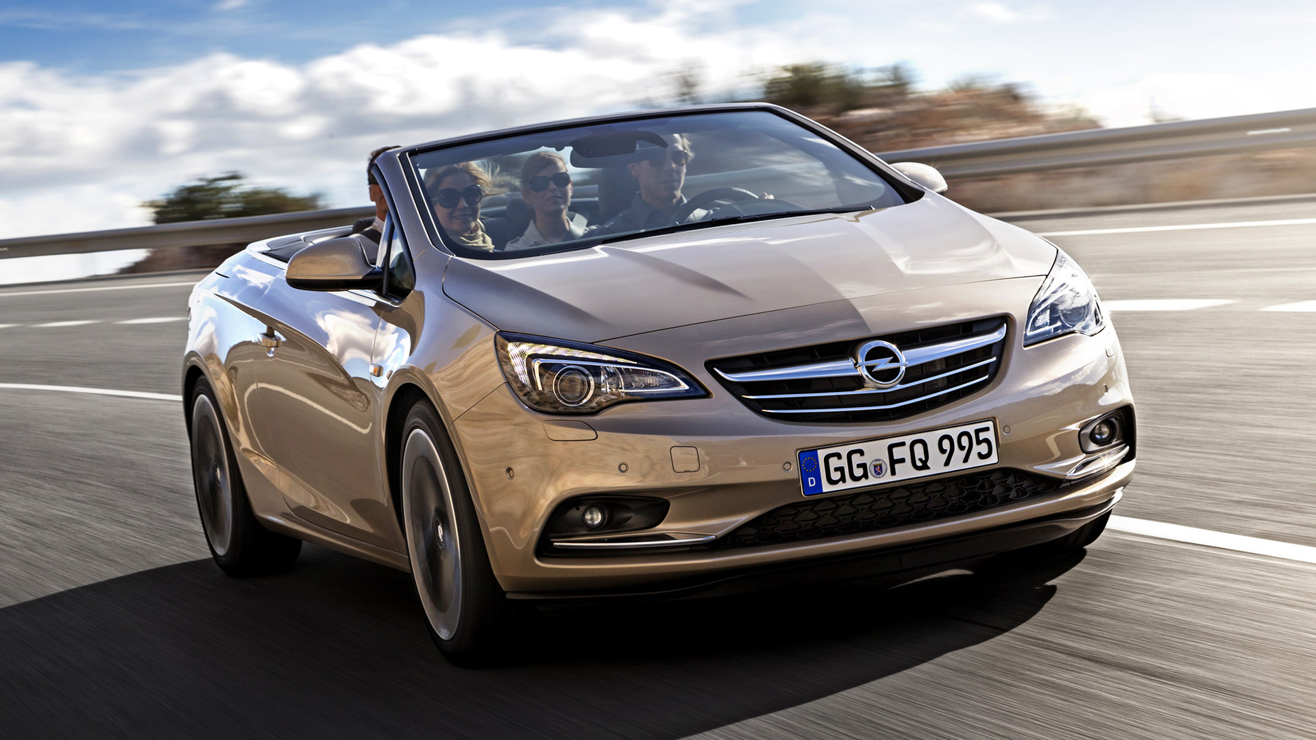 Description: A car driving down a road with a sky background and clouds in the background.