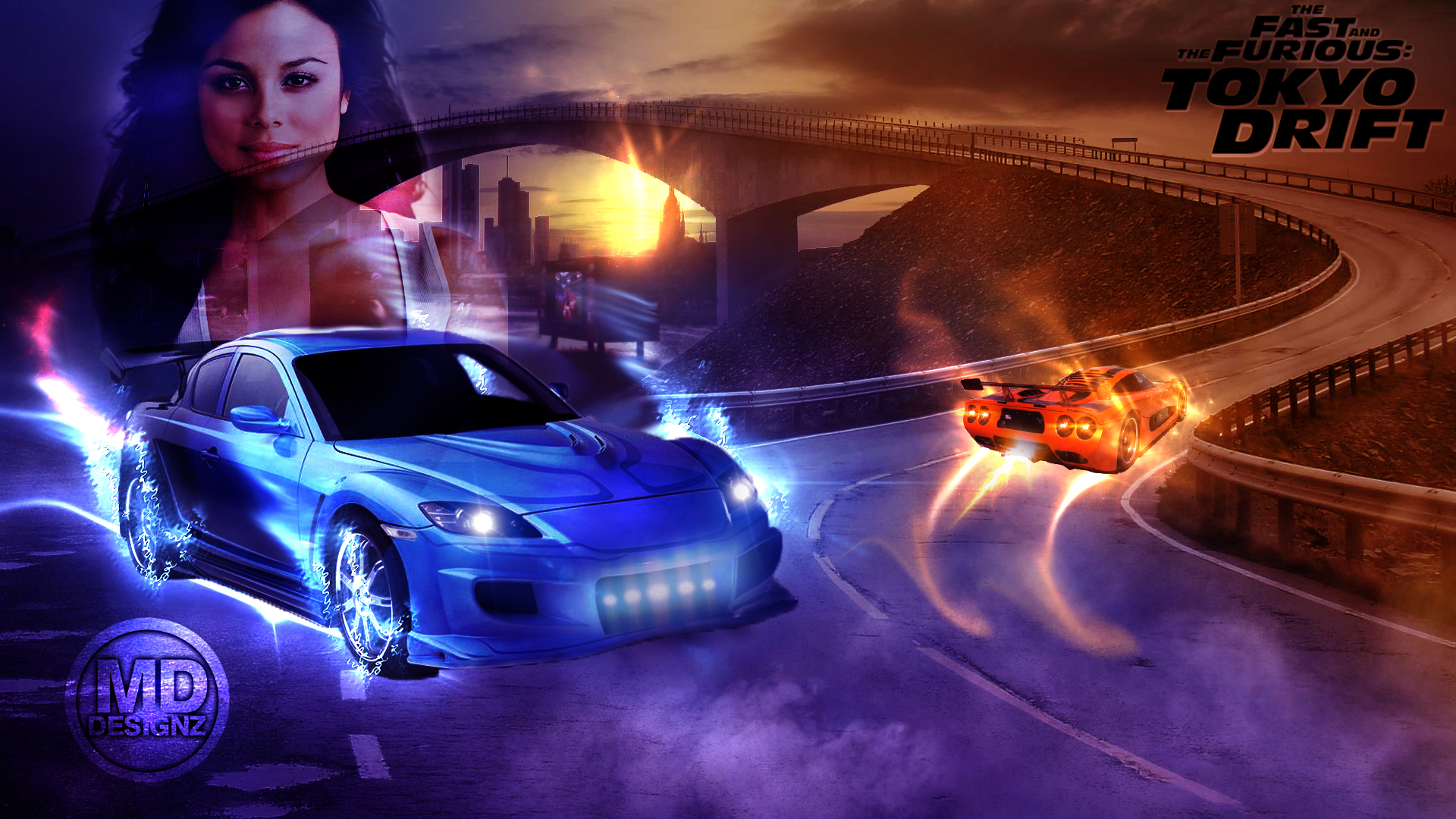 Description: A car driving down a road with a woman in the background and a car with a flame on it.
