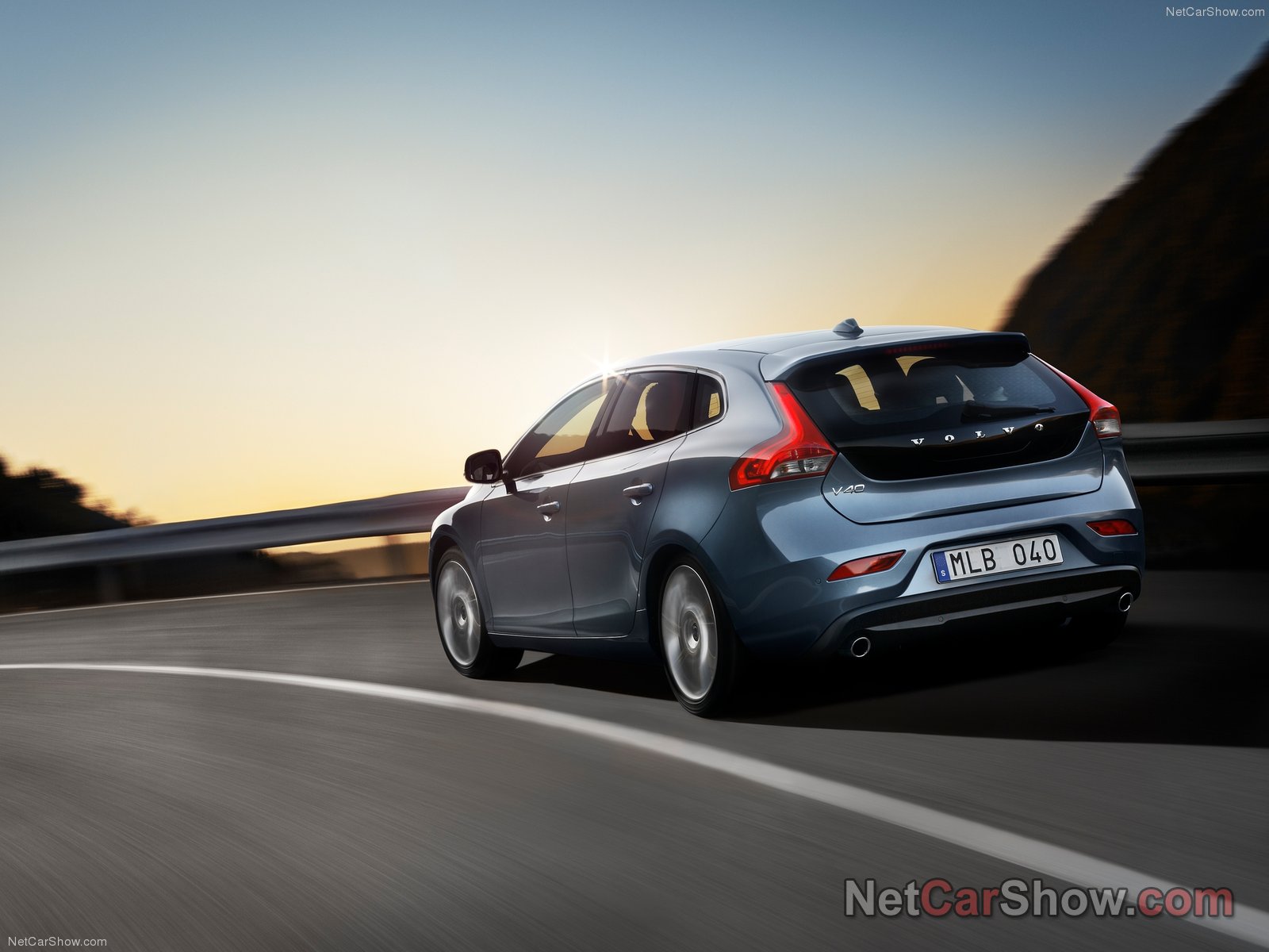 Description: A car driving down a road with a sunset in the background and a mountain in the background with a sky line.