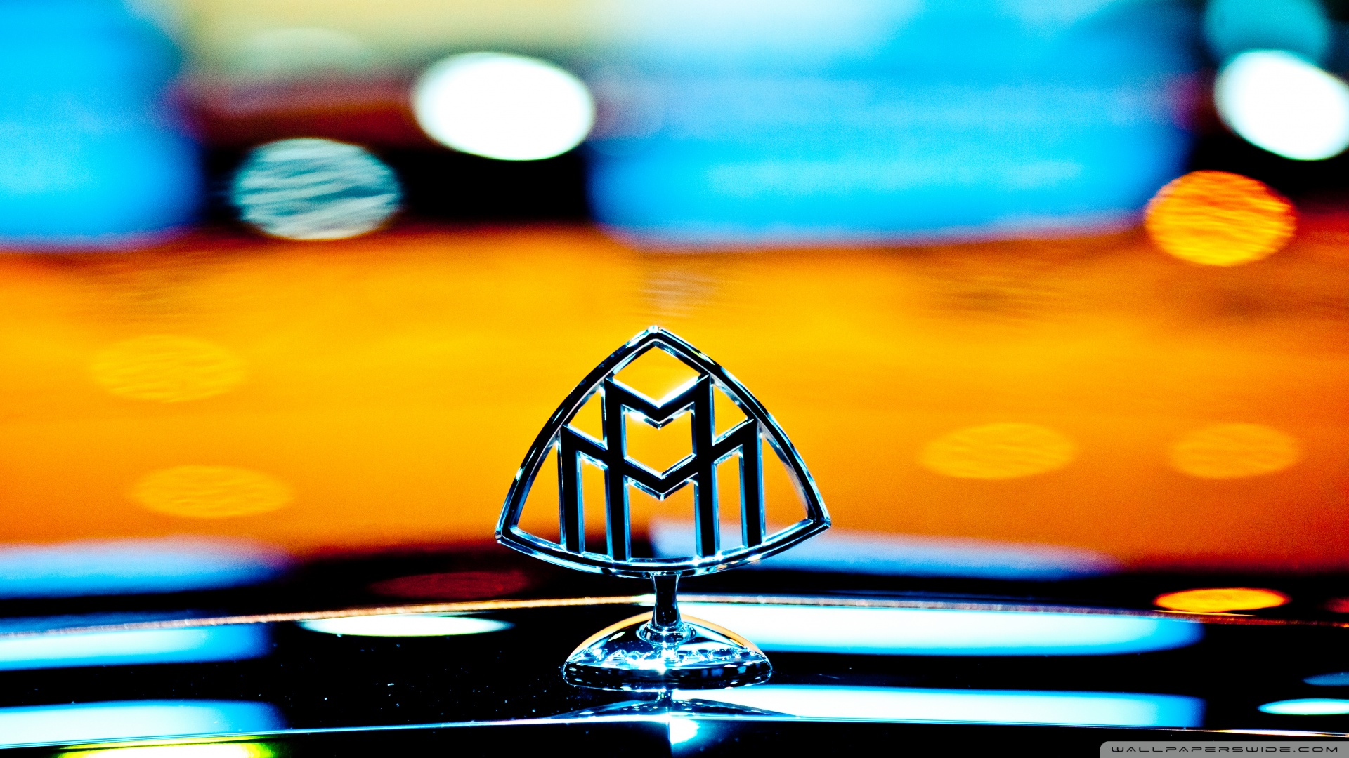 Description: A close up of a car emblem on a car hood ornament with blurry lights in the background.
