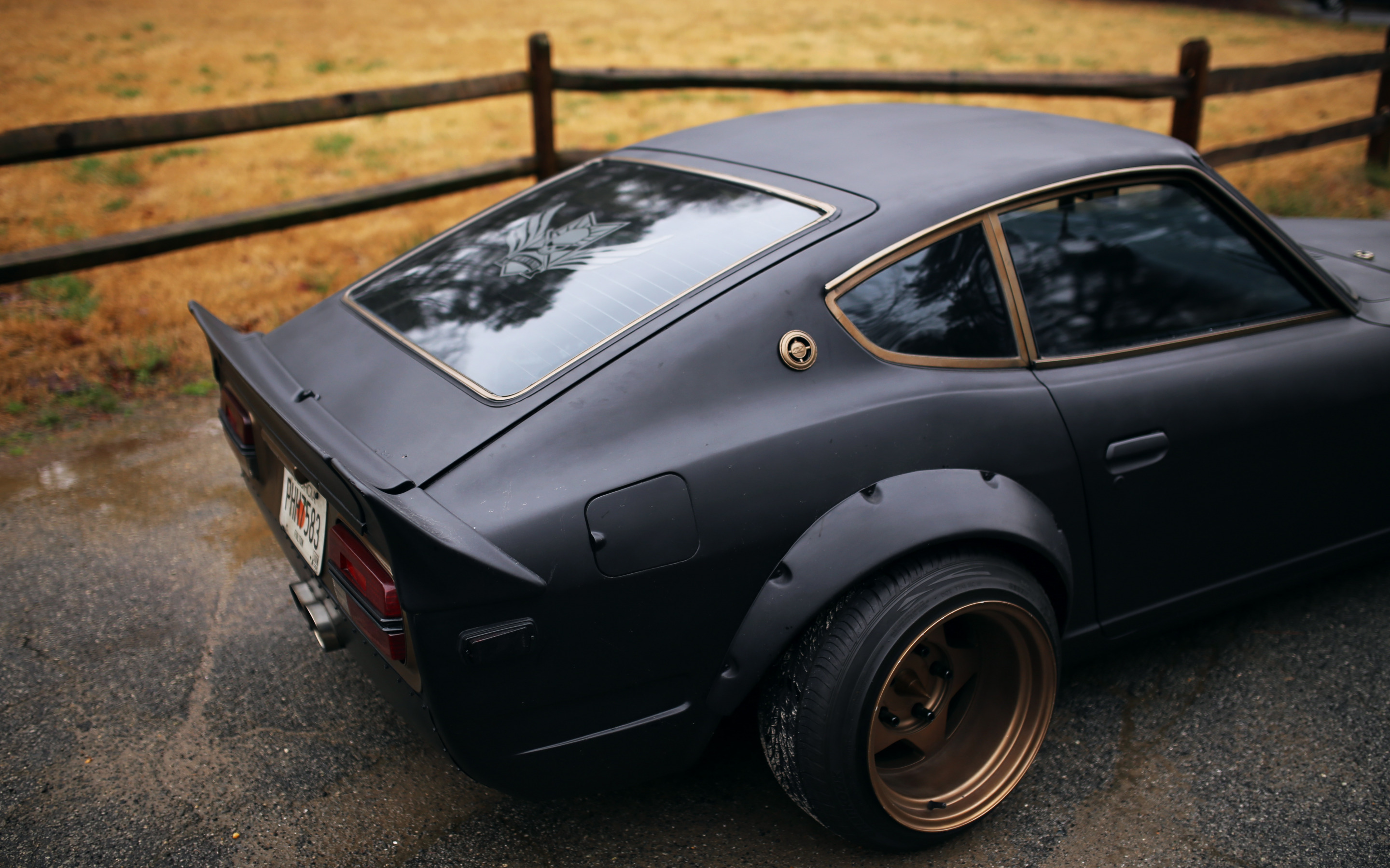 Description: A car parked in a parking lot next to a fence and a field with grass and trees in the background.