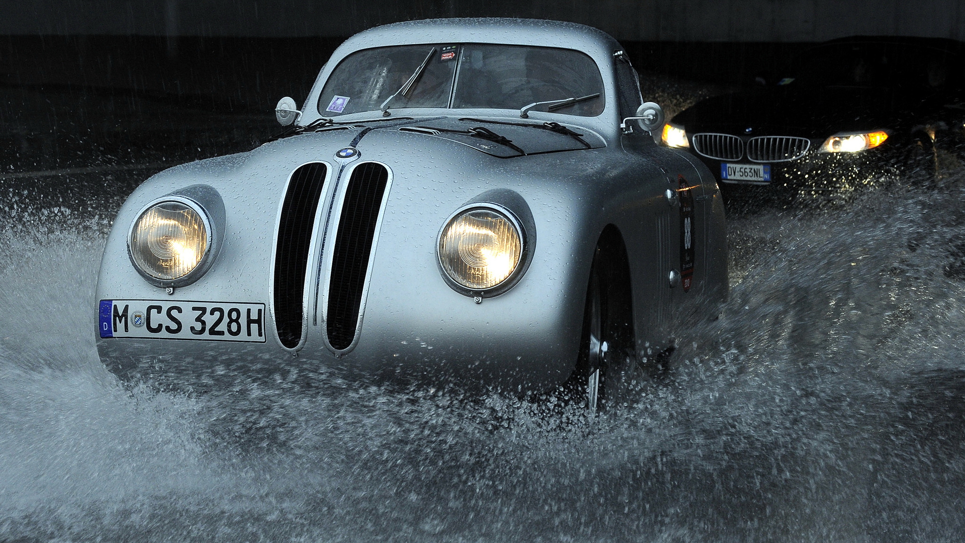 Description: A car driving through a flooded street in the rain with headlights on and a car behind it in the water.