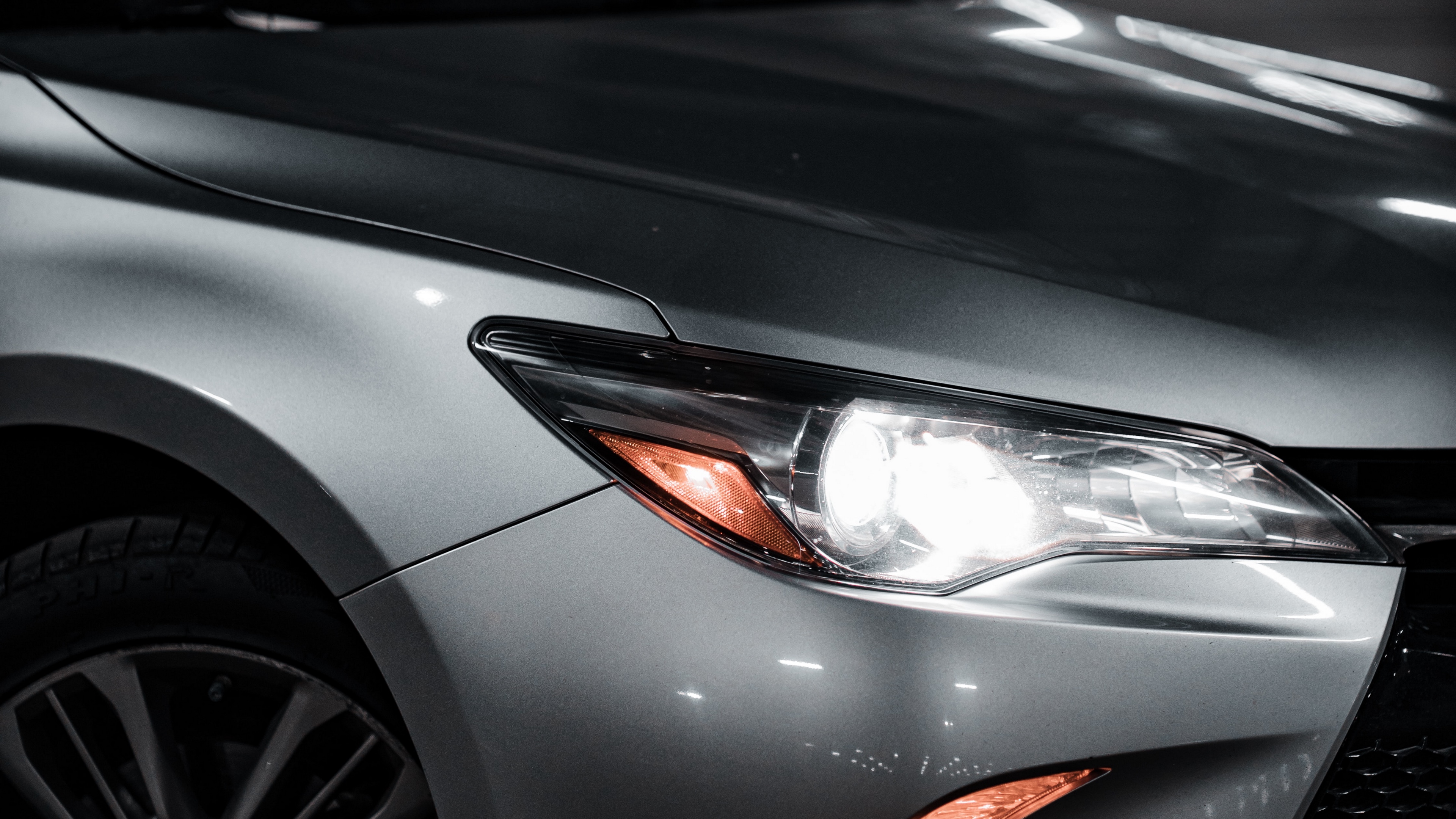 Description: A close up of a car with a light on it's headlight and a black background with a white spot.