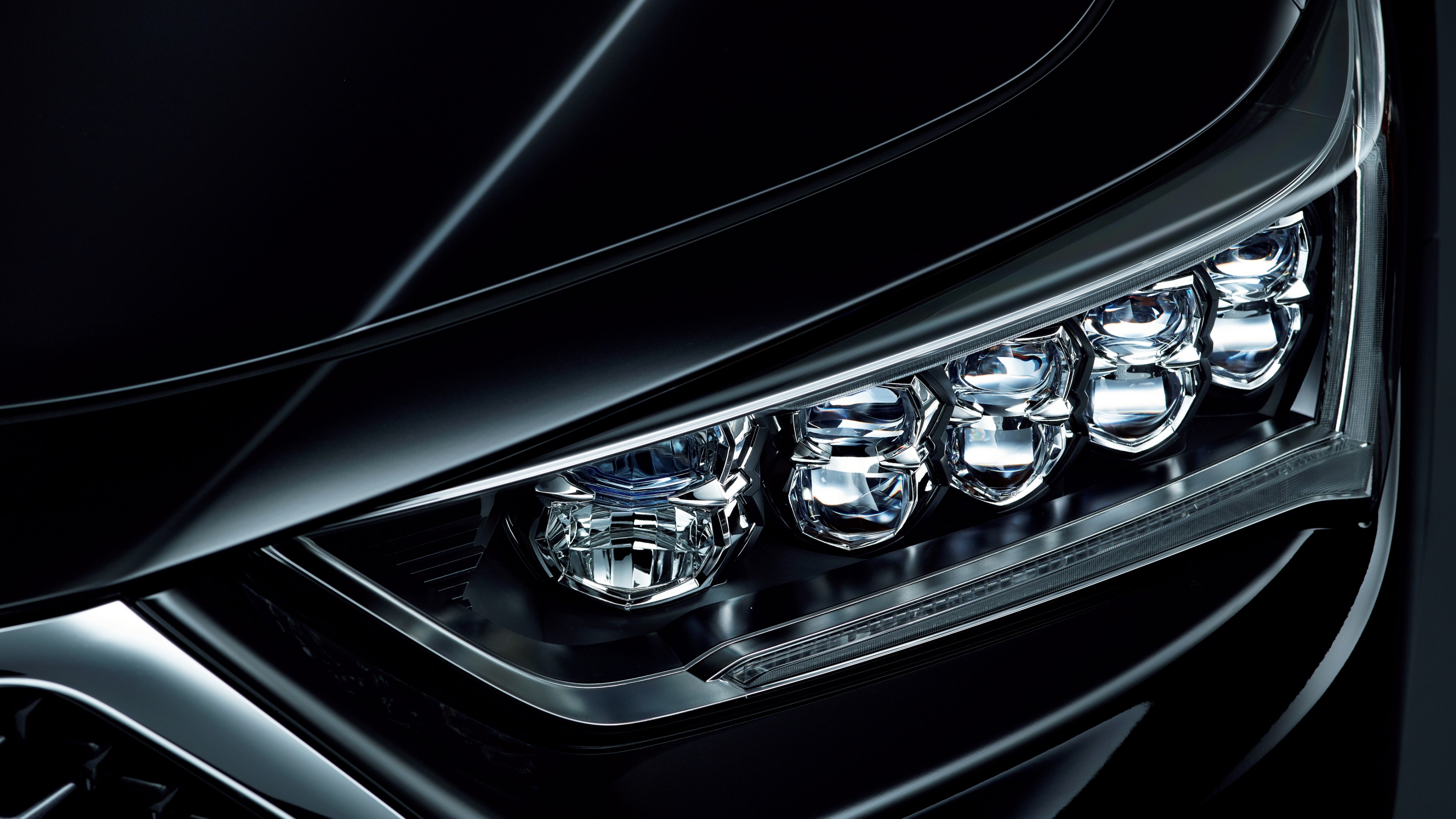 Description: A close up of a car headlight with chrome trims and chrome accents on a black background with a white background.