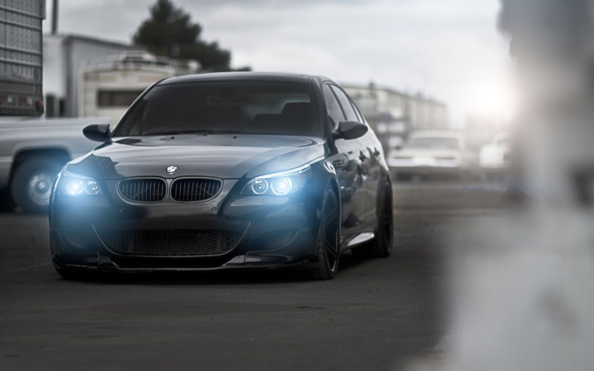 Description: A car that is sitting in the street with headlights on it's headlights and a blurry background.