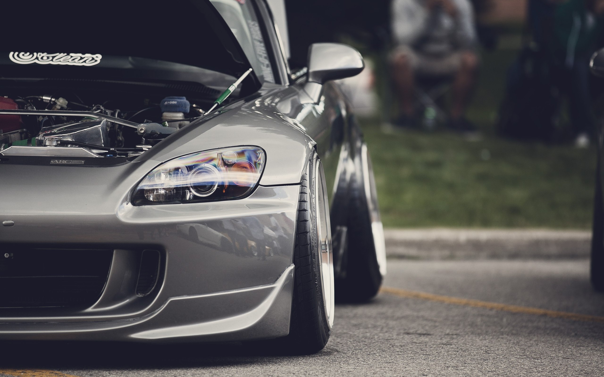 Description: A car with a hood open on a street with people around it and a car with a hood up.
