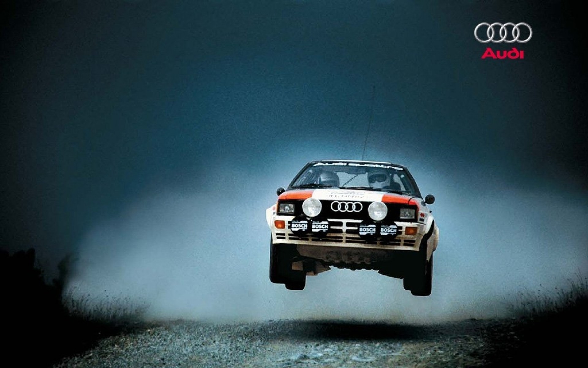 Description: A car jumping in the air with a sky background and a cloud of smoke behind it and the words audi written on the front.