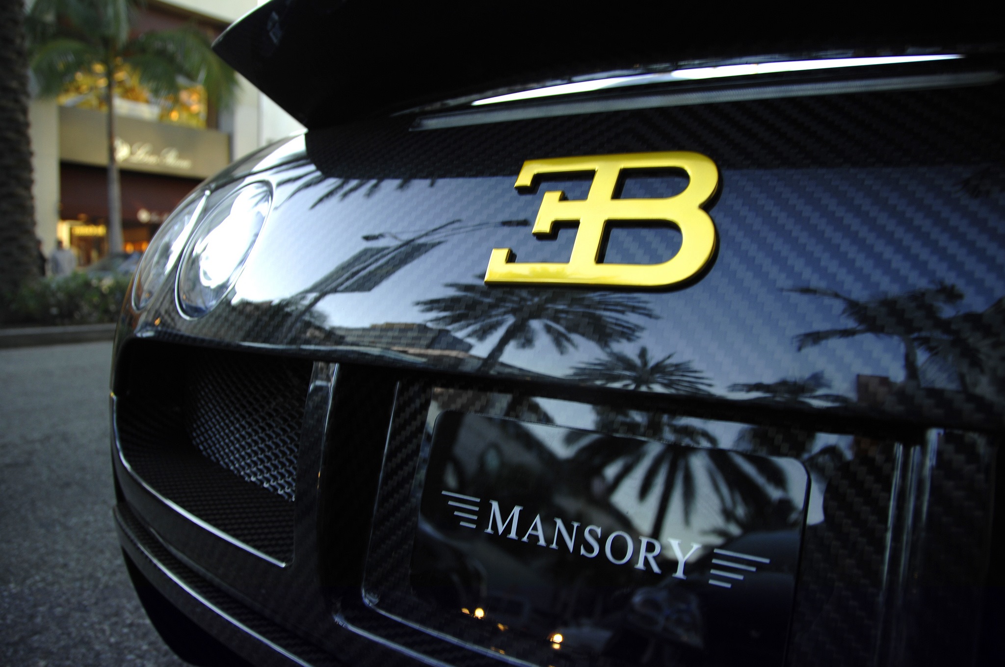 Description: A close up of a car with a logo on it's hood and a palm tree in the background.