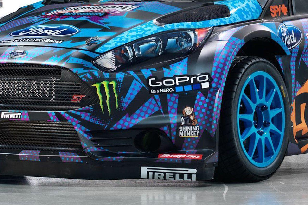 Description: A car with a monster design on it's front bumpers and a blue and orange paint job.