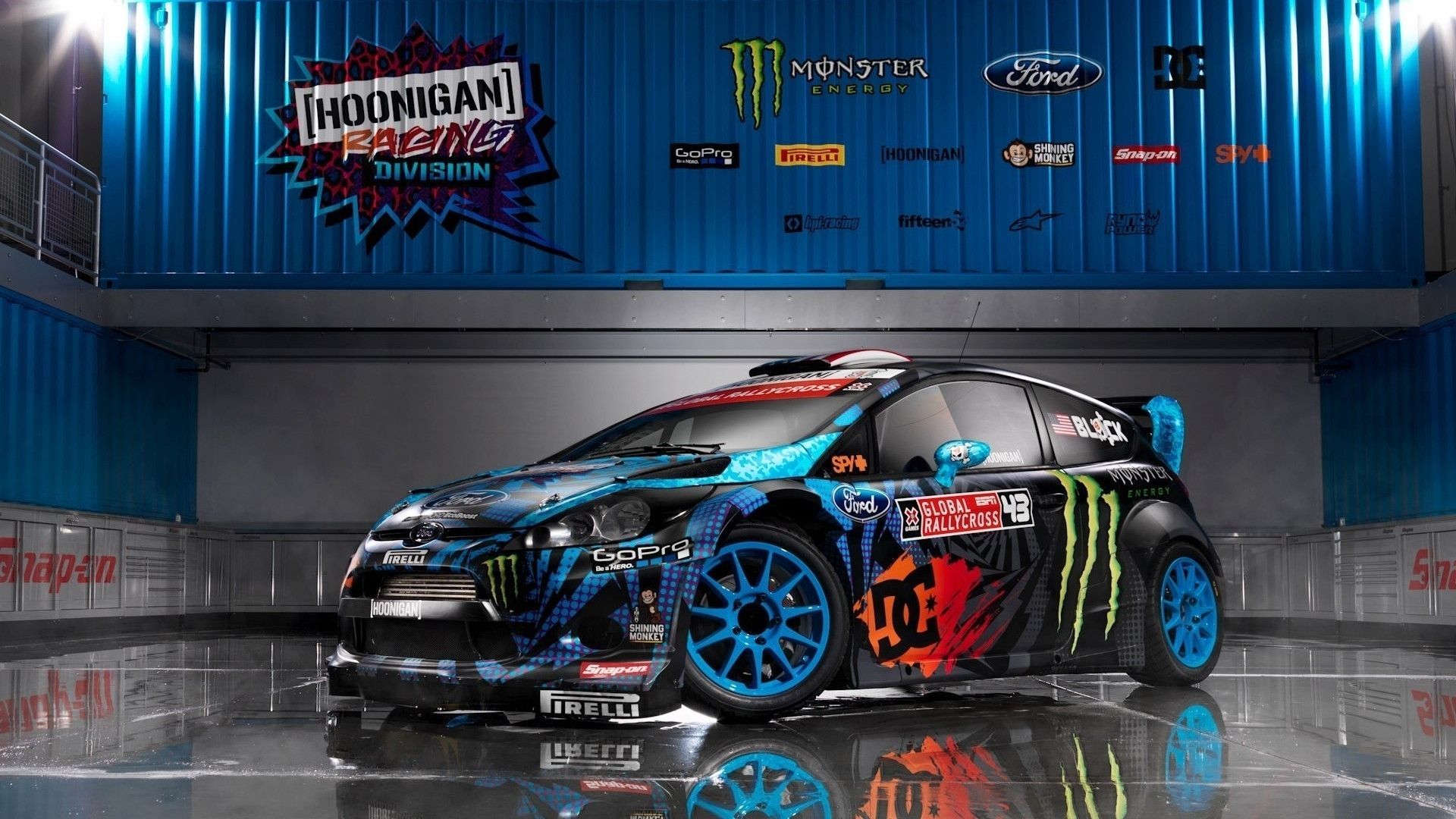 Description: A car with monster wheels painted on it's side in a garage with blue walls and a blue wall.