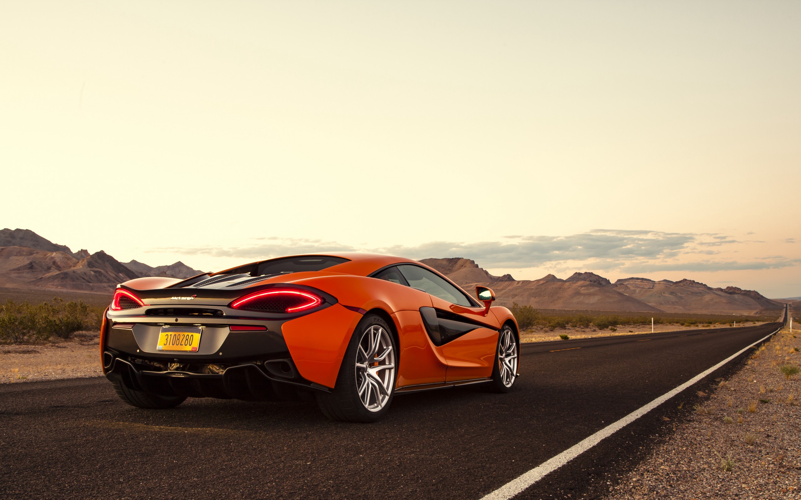 Description: A very nice looking car on the road by some mountains and hills in the background.