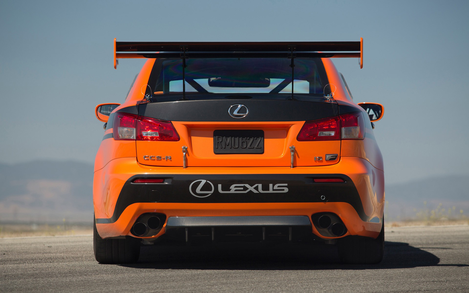 Description: A close up of a car on a road with mountains in the background and a sky background with no clouds.