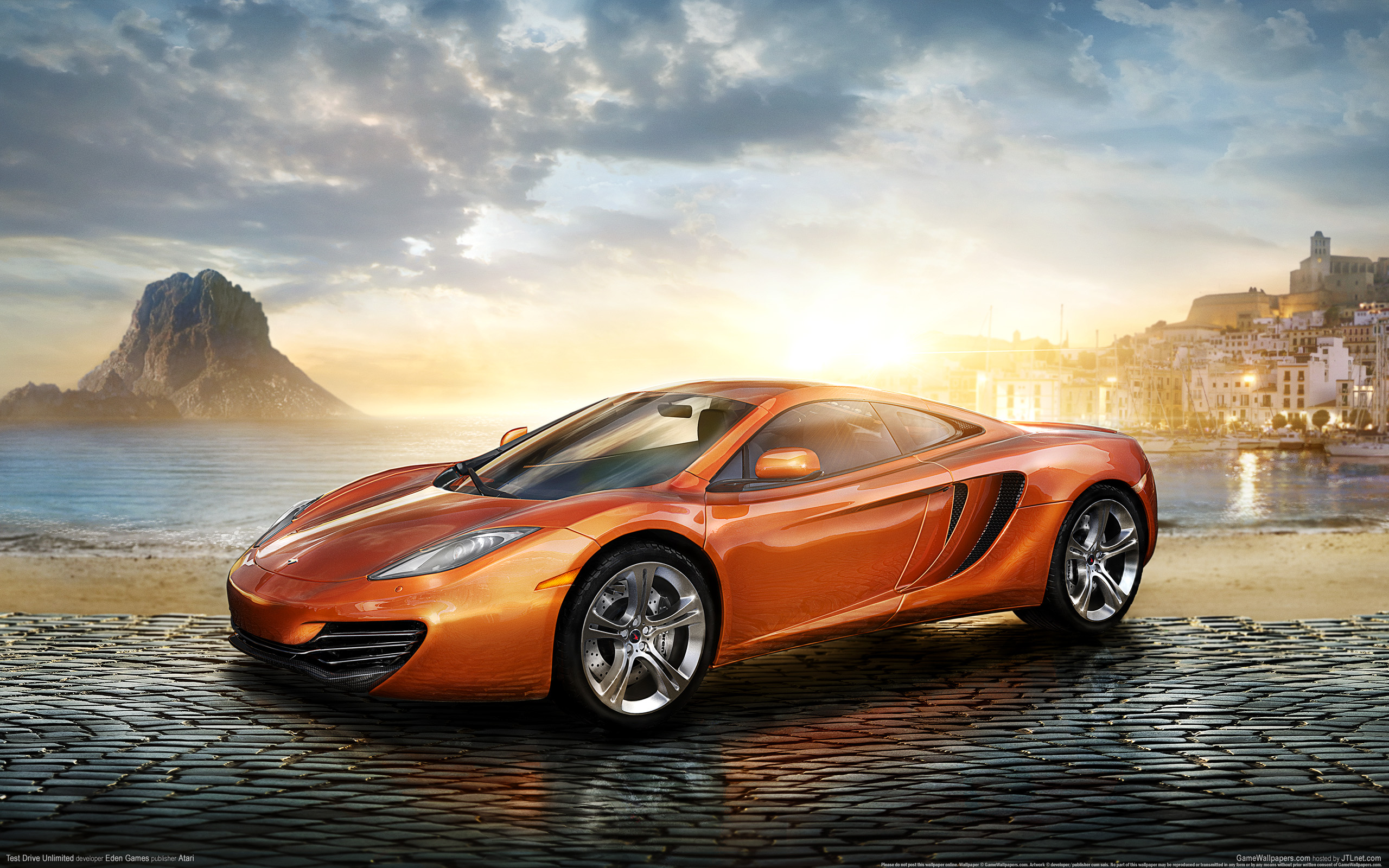 Description: A car parked on a cobblestone road near the ocean with a city in the background at sunset.