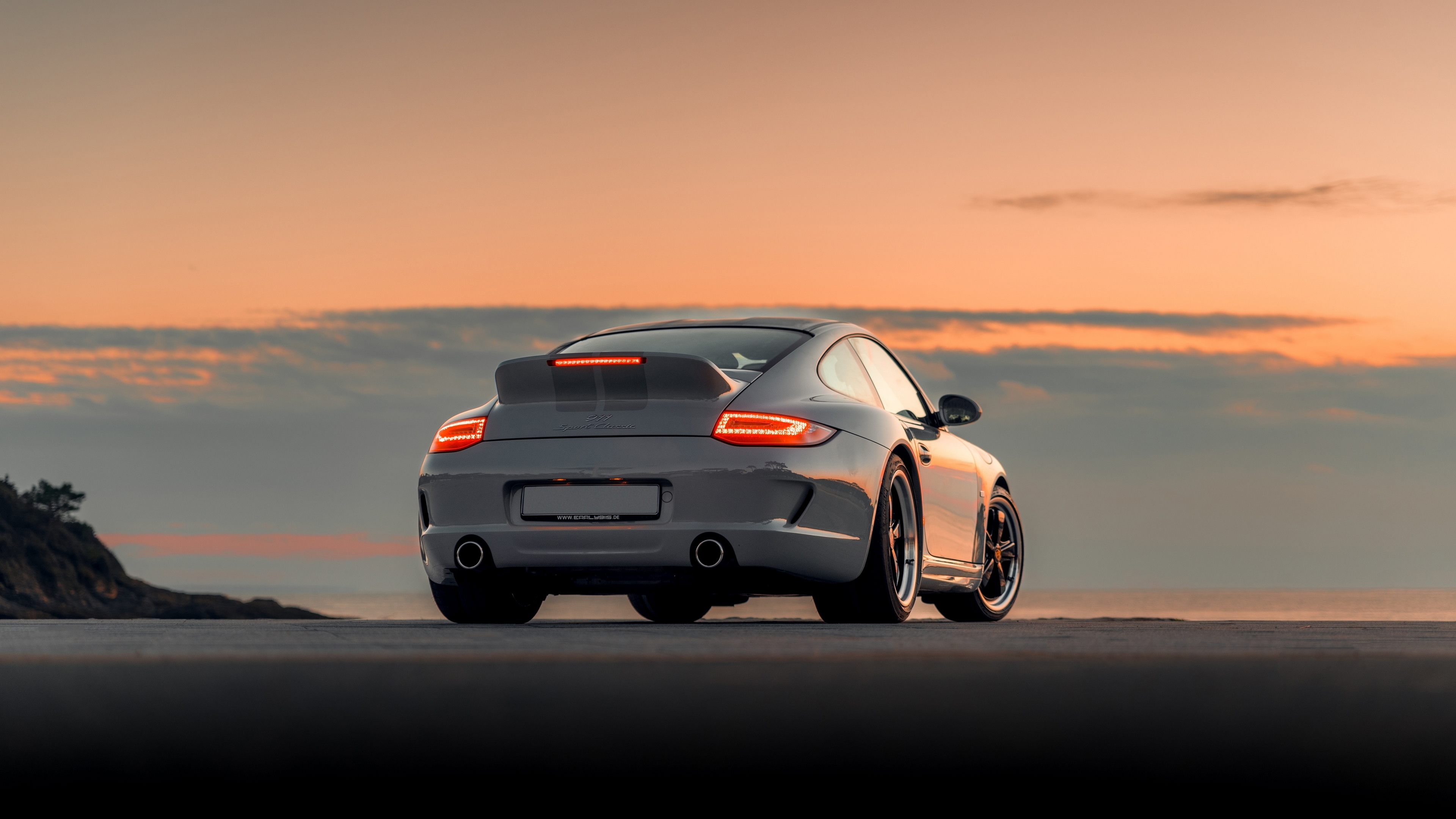 Description: A car parked on the side of the road near the ocean at sunset or dawn with a sky background.