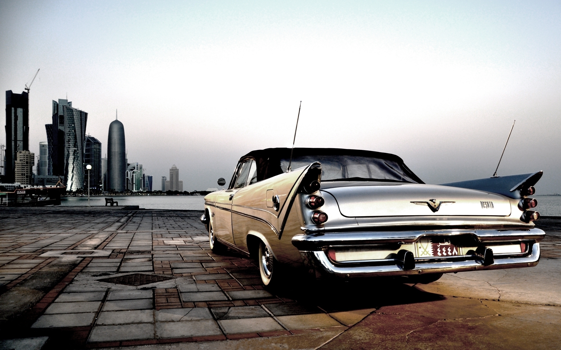 Description: A car parked on a brick road next to a city skyline with tall buildings in the background and a person standing next to it.