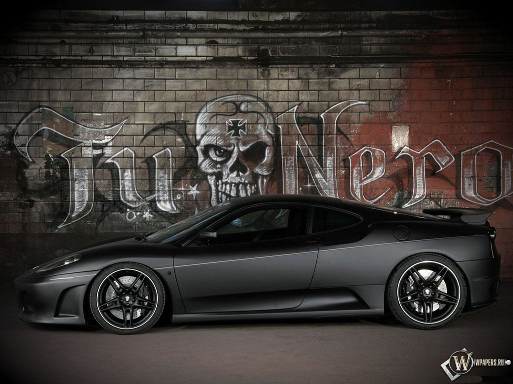 Description: A car parked in front of a brick wall with graffiti on it's side and a skull on the wall behind it.