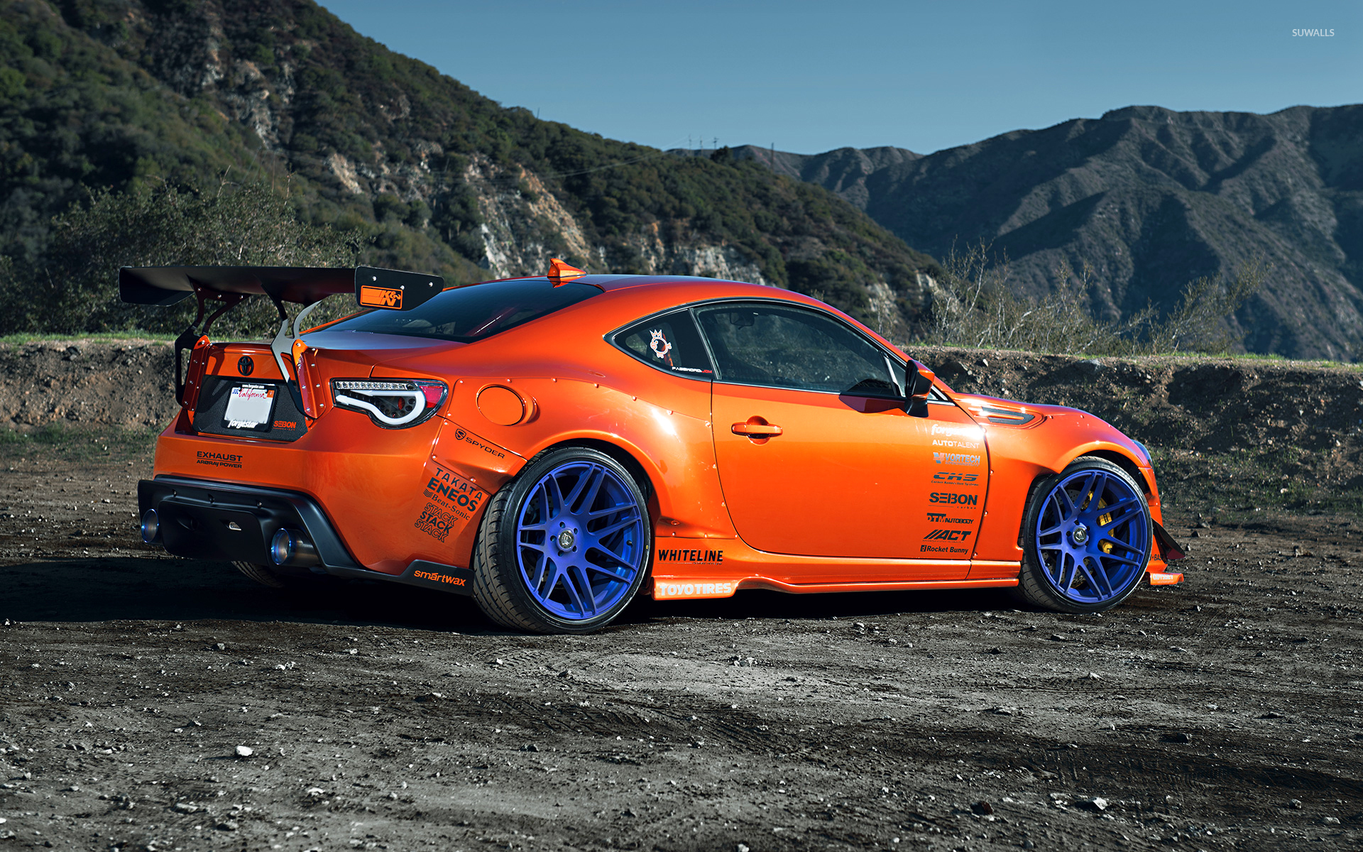 Description: A car parked on a dirt road near a mountain range with a mountain in the background and a blue sky.