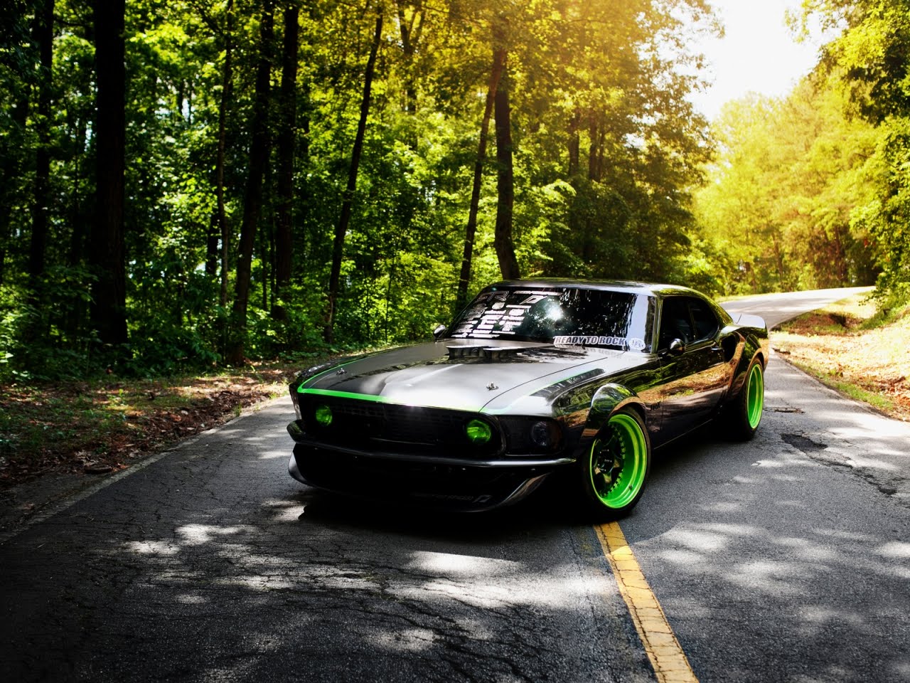 Description: A car parked on the side of a road near trees and a forest with a green rim and hood.