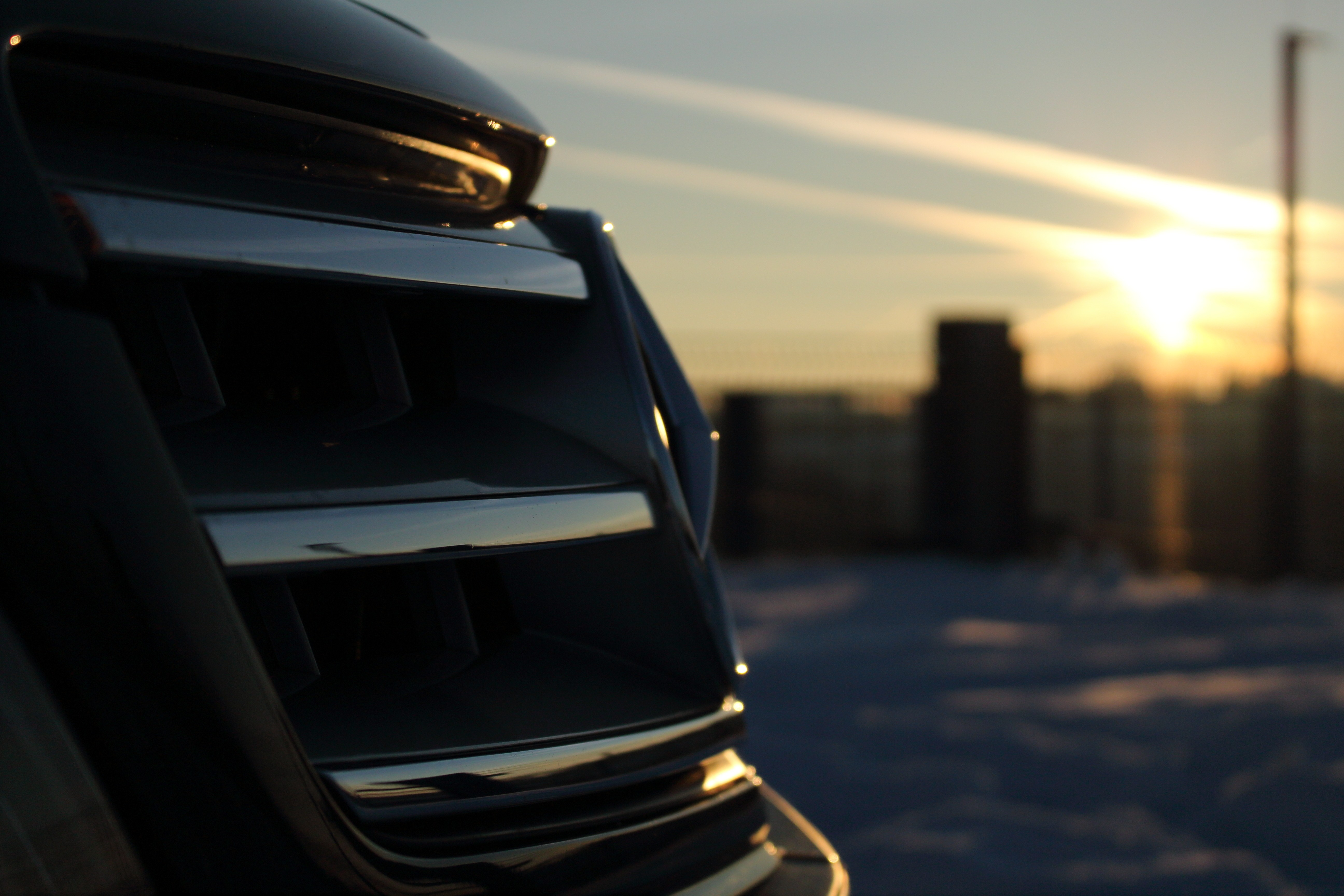 Description: A car parked in the snow with the sun setting behind it and a building in the background with a few clouds.