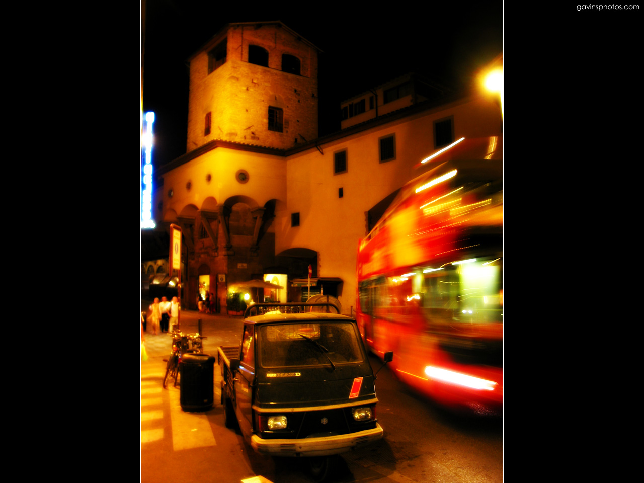 Description: A car parked on the side of a street next to a building with a clock tower on it's side.