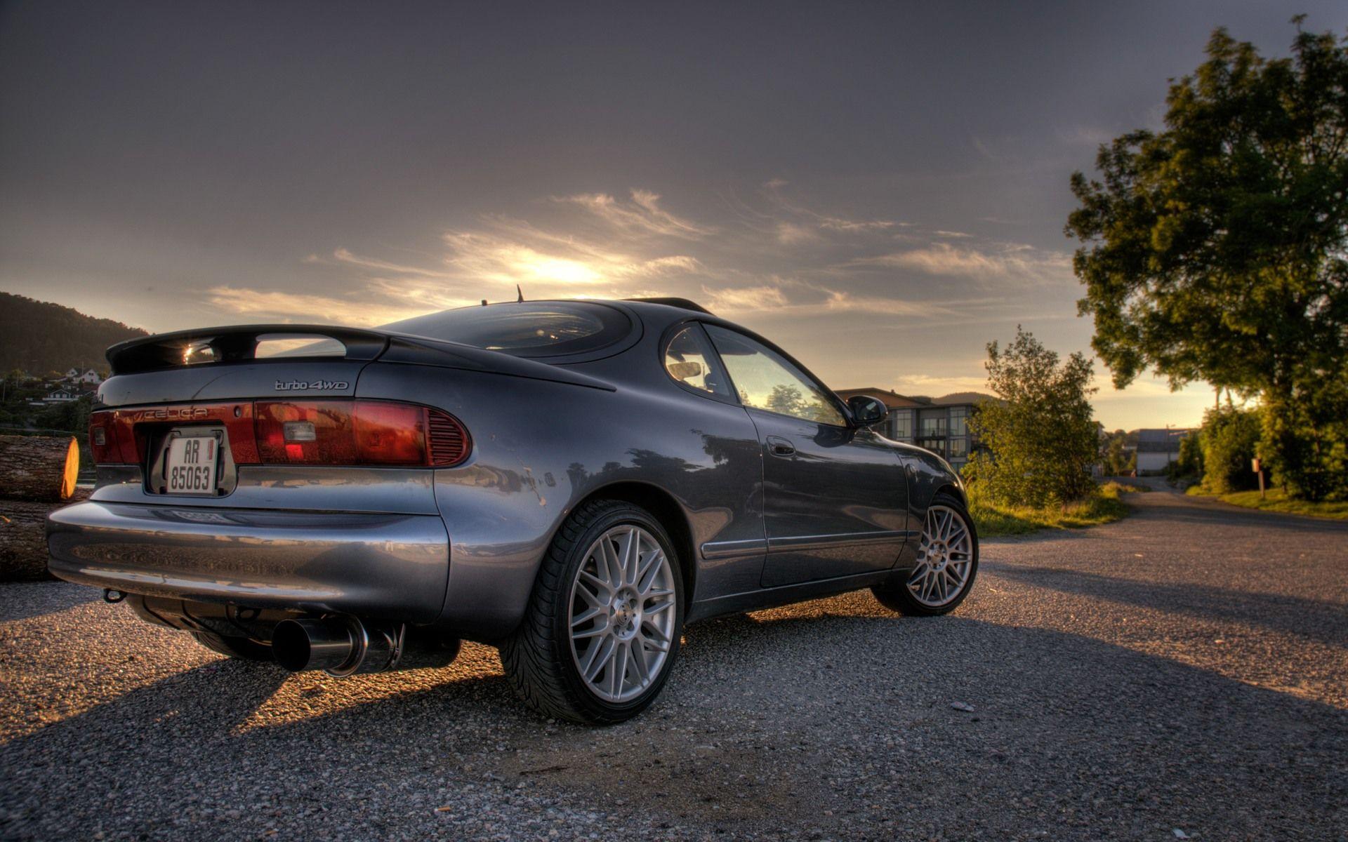 Description: A car parked on the side of the road with the sun shining through the clouds behind it and a tree in the foreground.