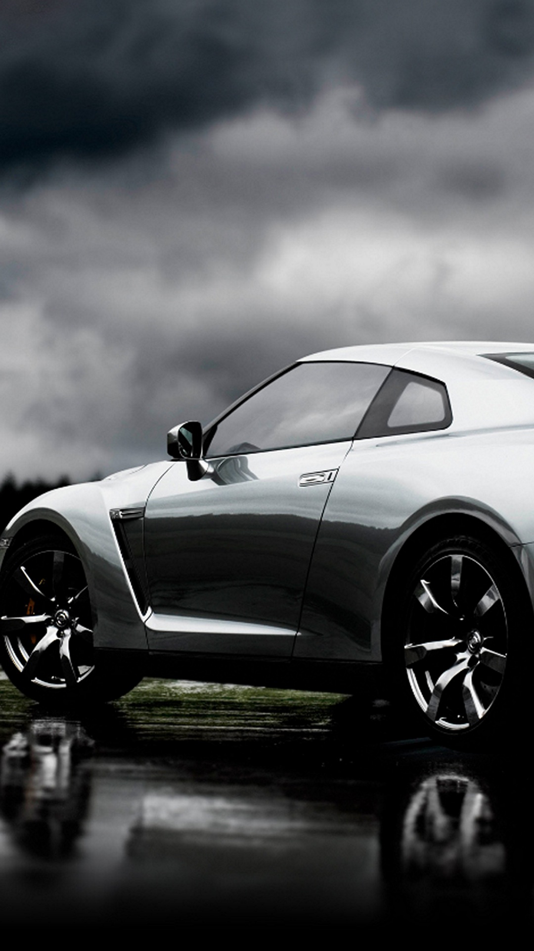 Description: A car parked on a wet road under a cloudy sky with a reflection on the ground and a reflection of the car.