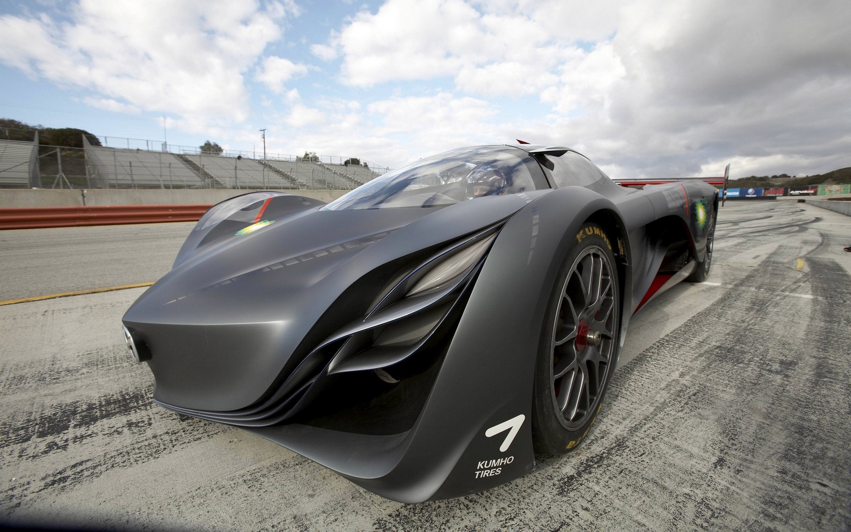 Description: A car driving on a race track with clouds in the background and a sky background with clouds in the sky.