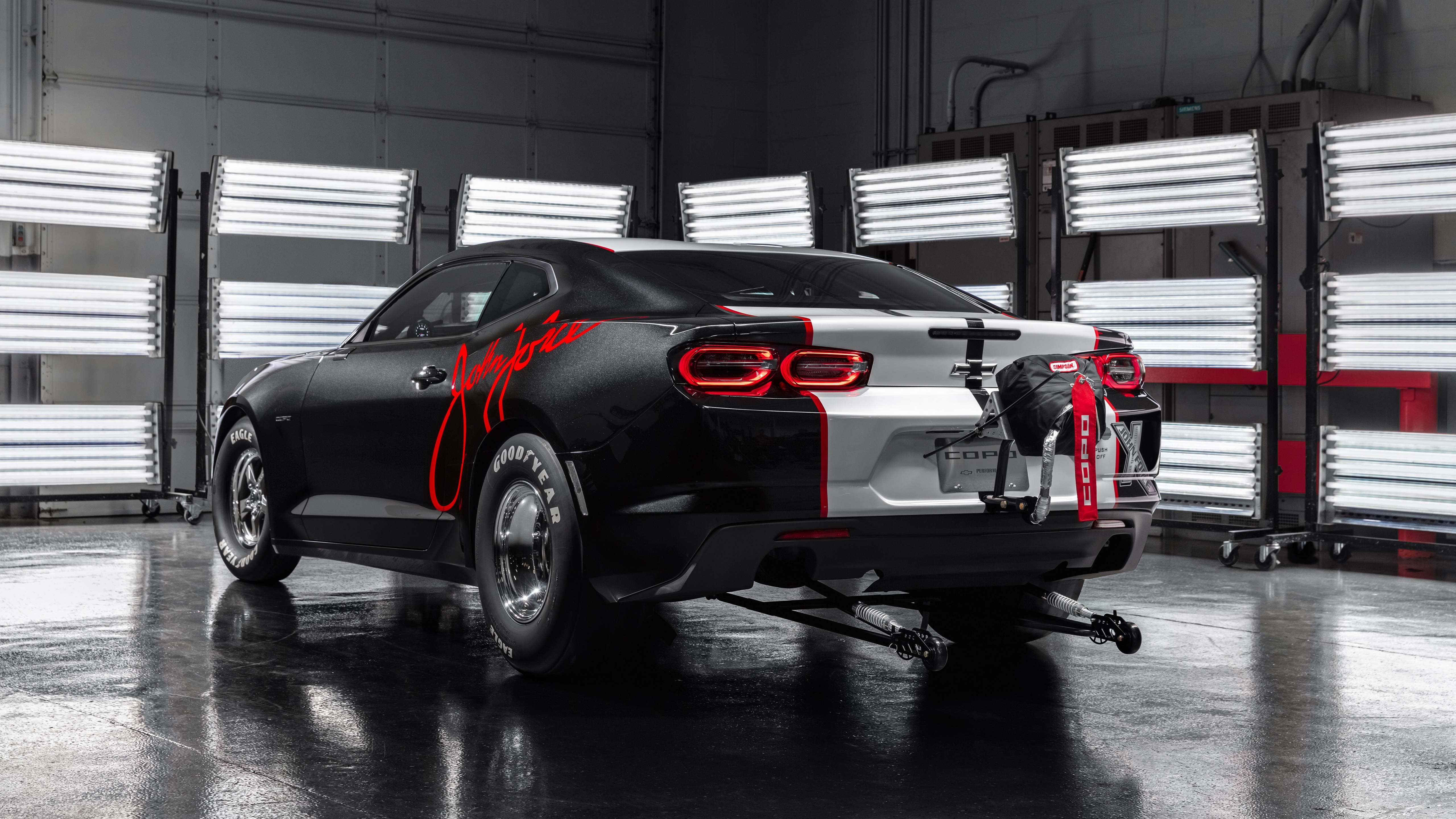 Description: A car with a red light on it's tail lights and a car lift behind it in a garage.