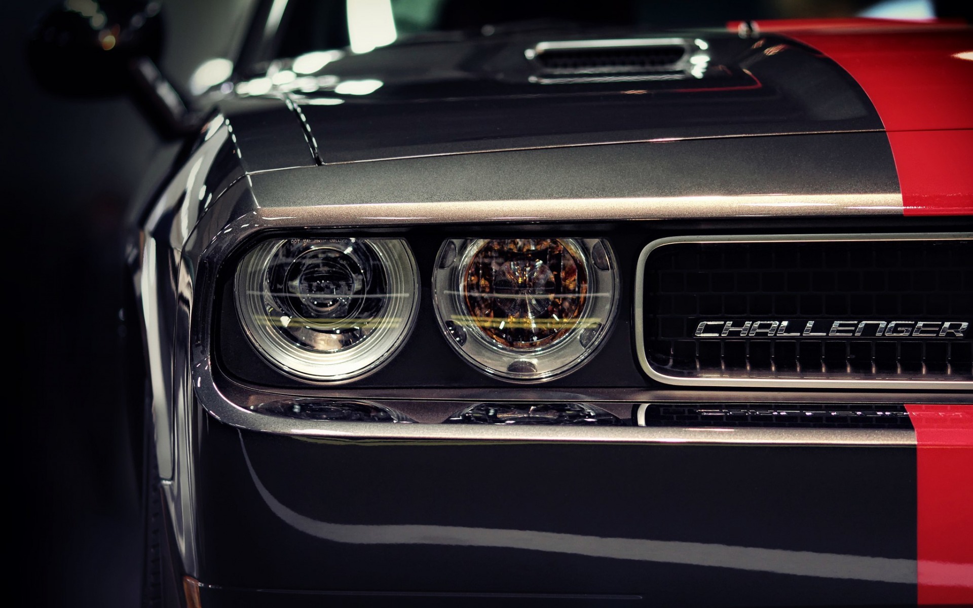 Description: A close up of a car with a red stripe on it's hood and the front lights of the car.