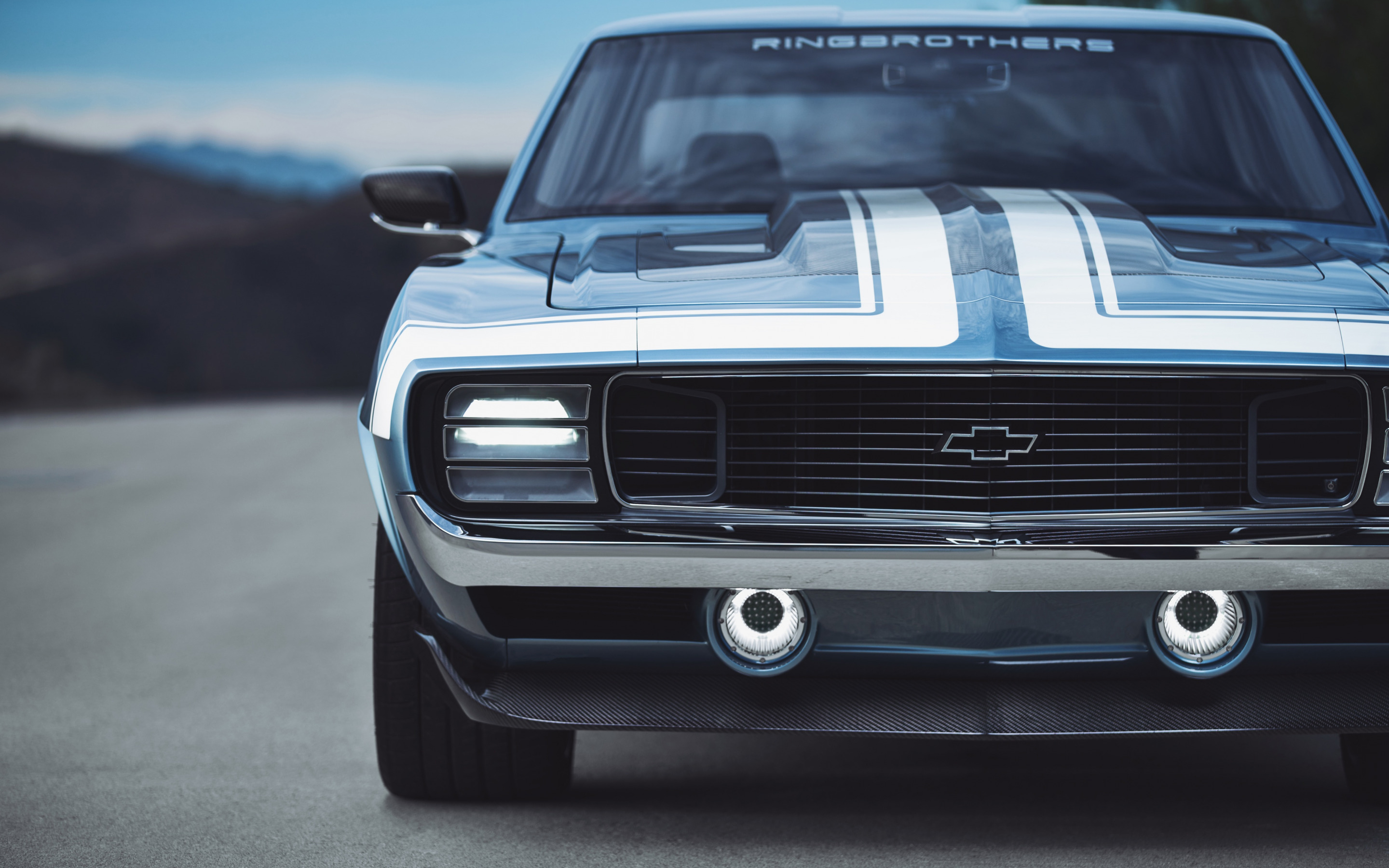 Description: A close up of a car on a road with mountains in the background and a sky background with clouds.
