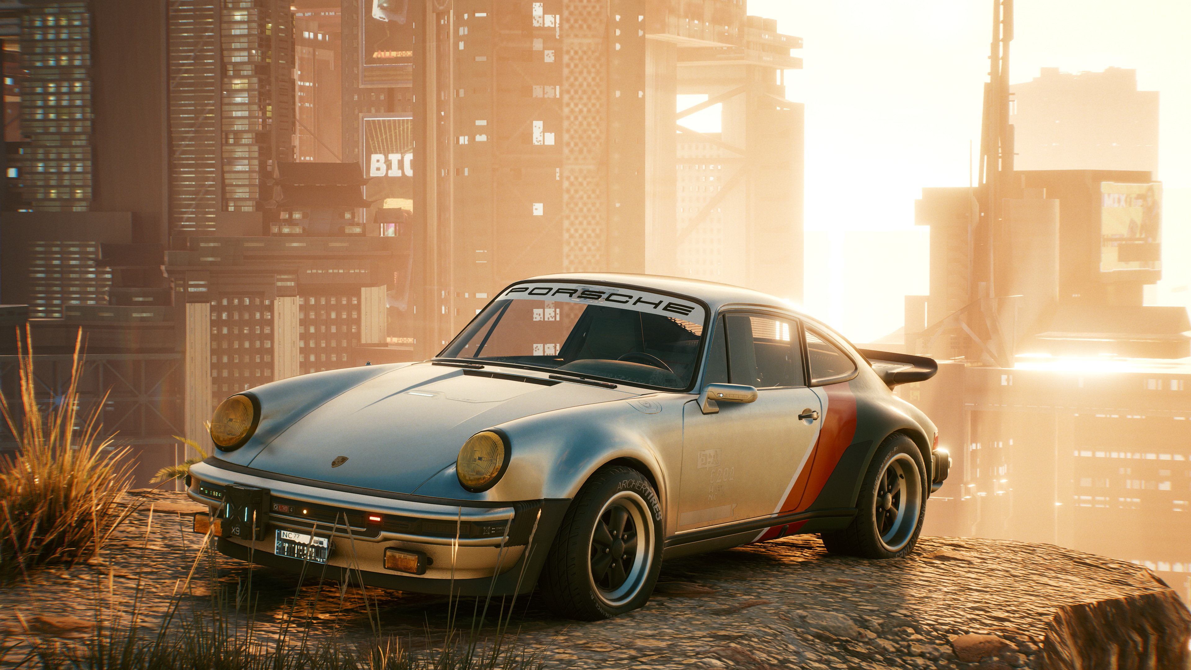 Description: A car parked on a rock in a city setting with skyscrapers in the background and a sunbeam.