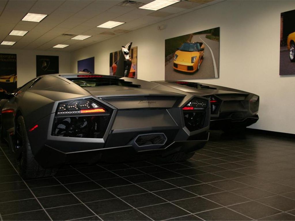 Description: A car is parked in a showroom with other cars in the background and a man standing next to it.
