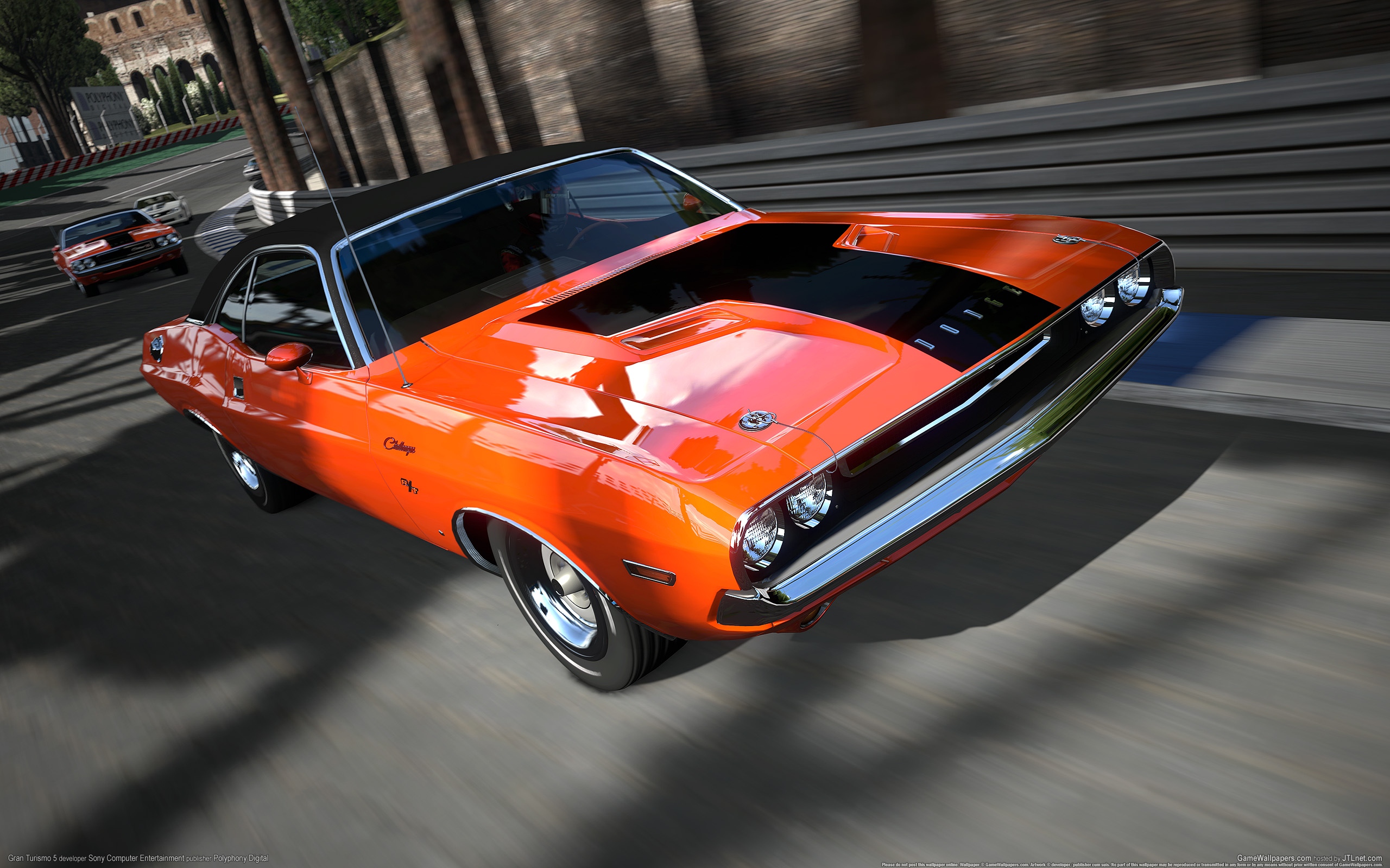 Description: A car driving down a street next to a building and a street sign with a red car on it.