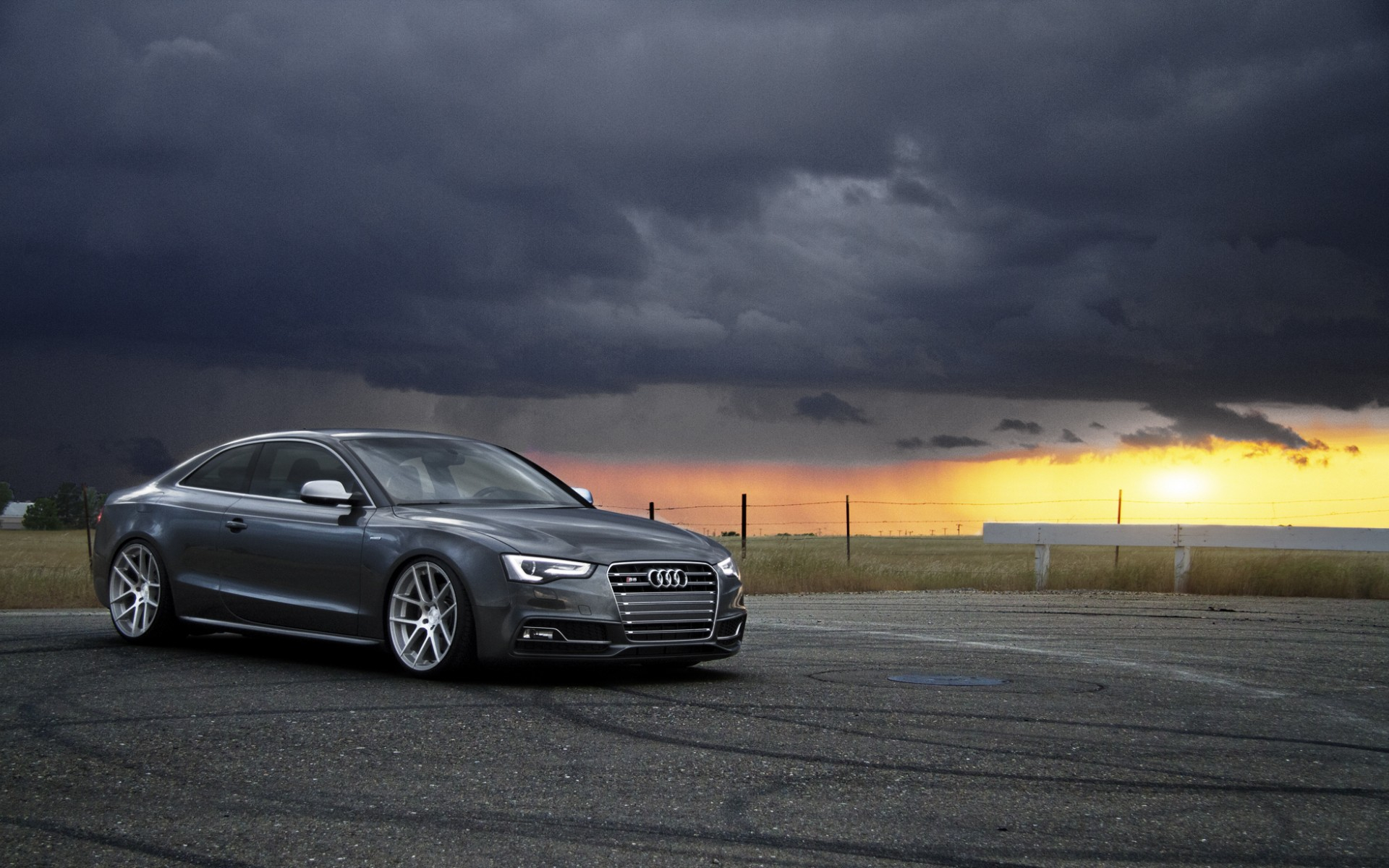 Description: A car parked in a parking lot under a cloudy sky with a sun setting behind it and a dark cloud.
