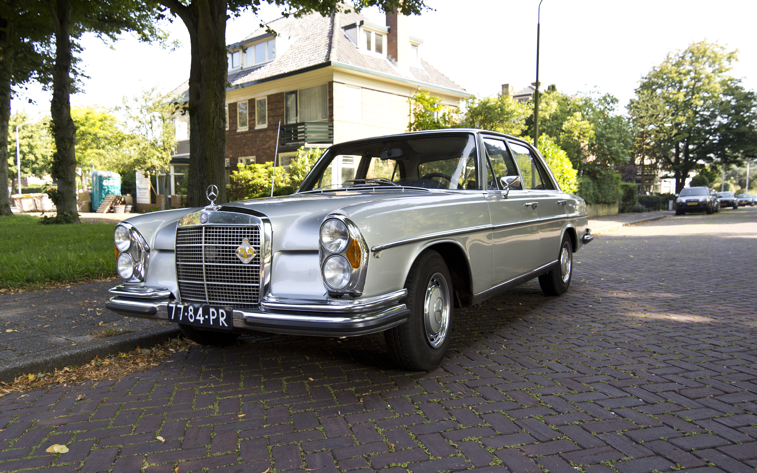 Description: A car parked on the side of a road next to a tree and a house on the other side.