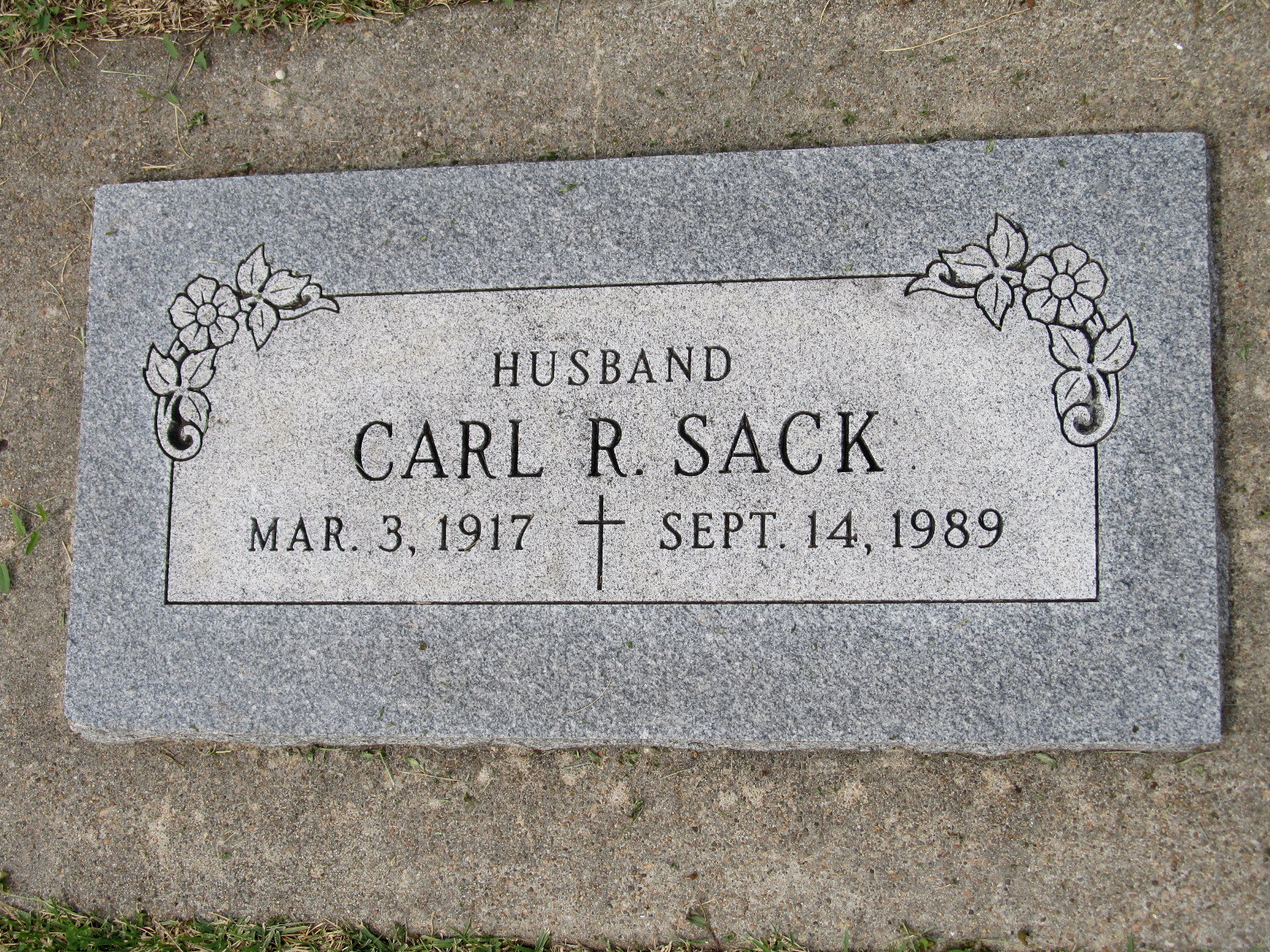 Description: A grave marker for carl r sack is shown on the sidewalk of a cemetery in the city of chicago.