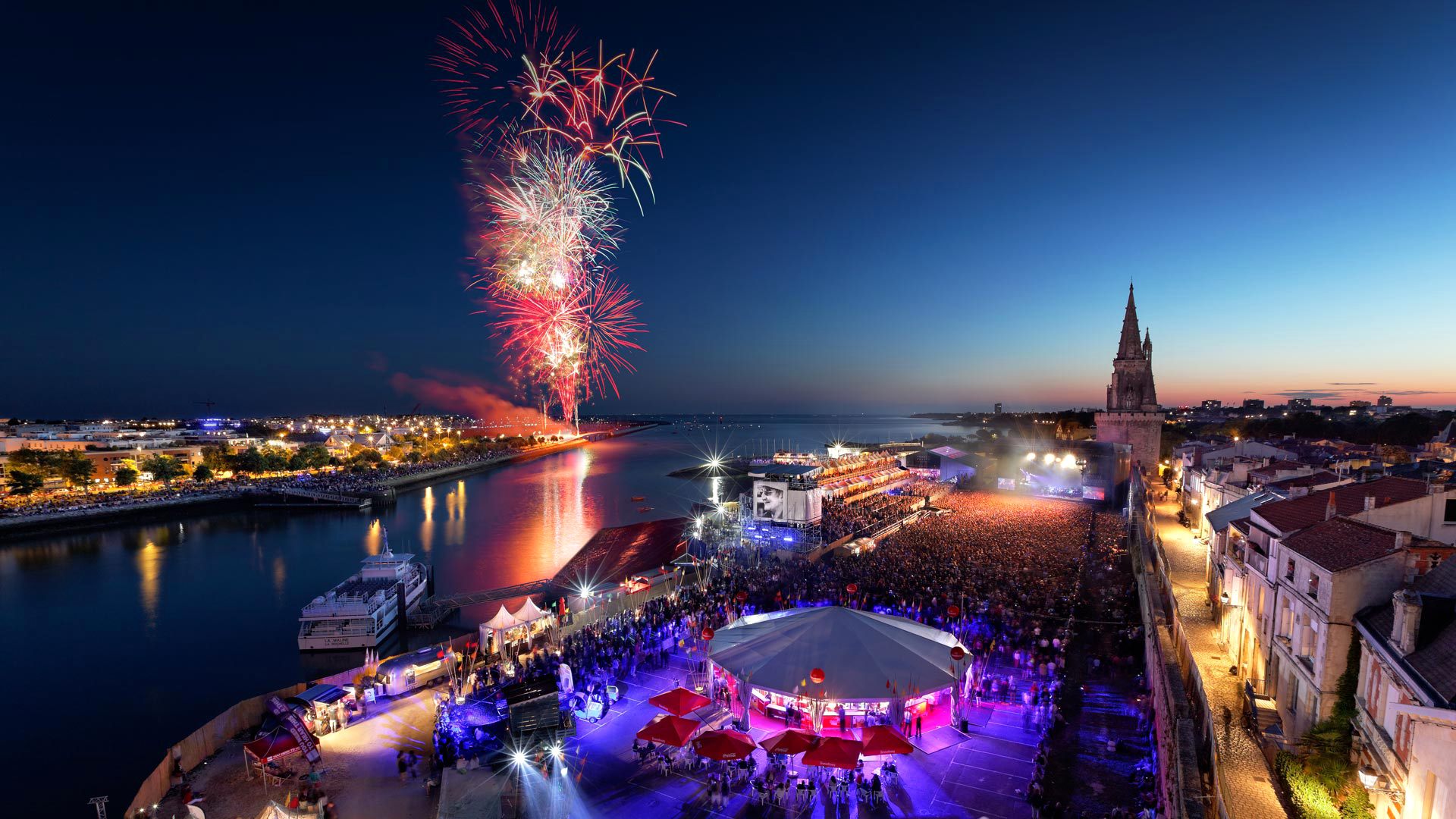 Description: A large crowd of people standing around a carnival at night time with fireworks in the sky above them and a carnival tent.