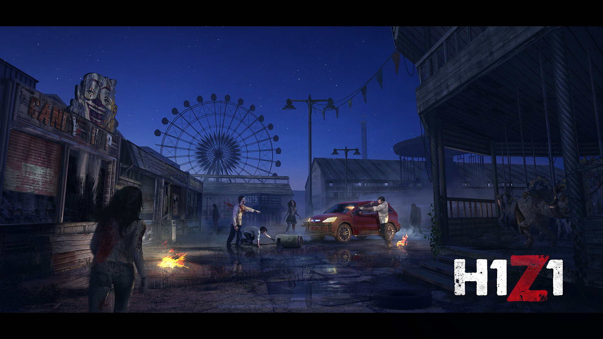 Description: A group of people standing around a carnival at night with a ferris wheel in the background and a person standing on the sidewalk.