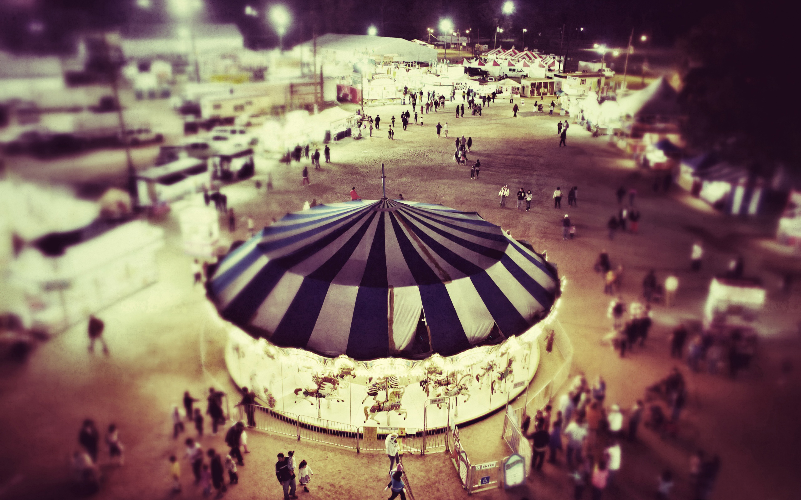 Description: A carousel is lit up at night with people around it and a large tent in the middle of the ground.