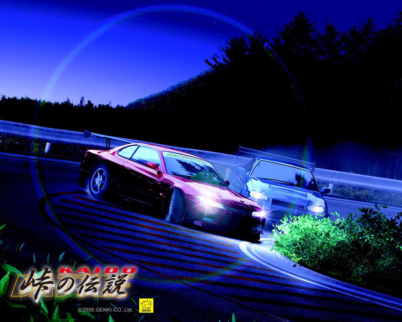 Description: A couple of cars driving down a road at night time with a rainbow in the sky above them and a rainbow in the sky above.