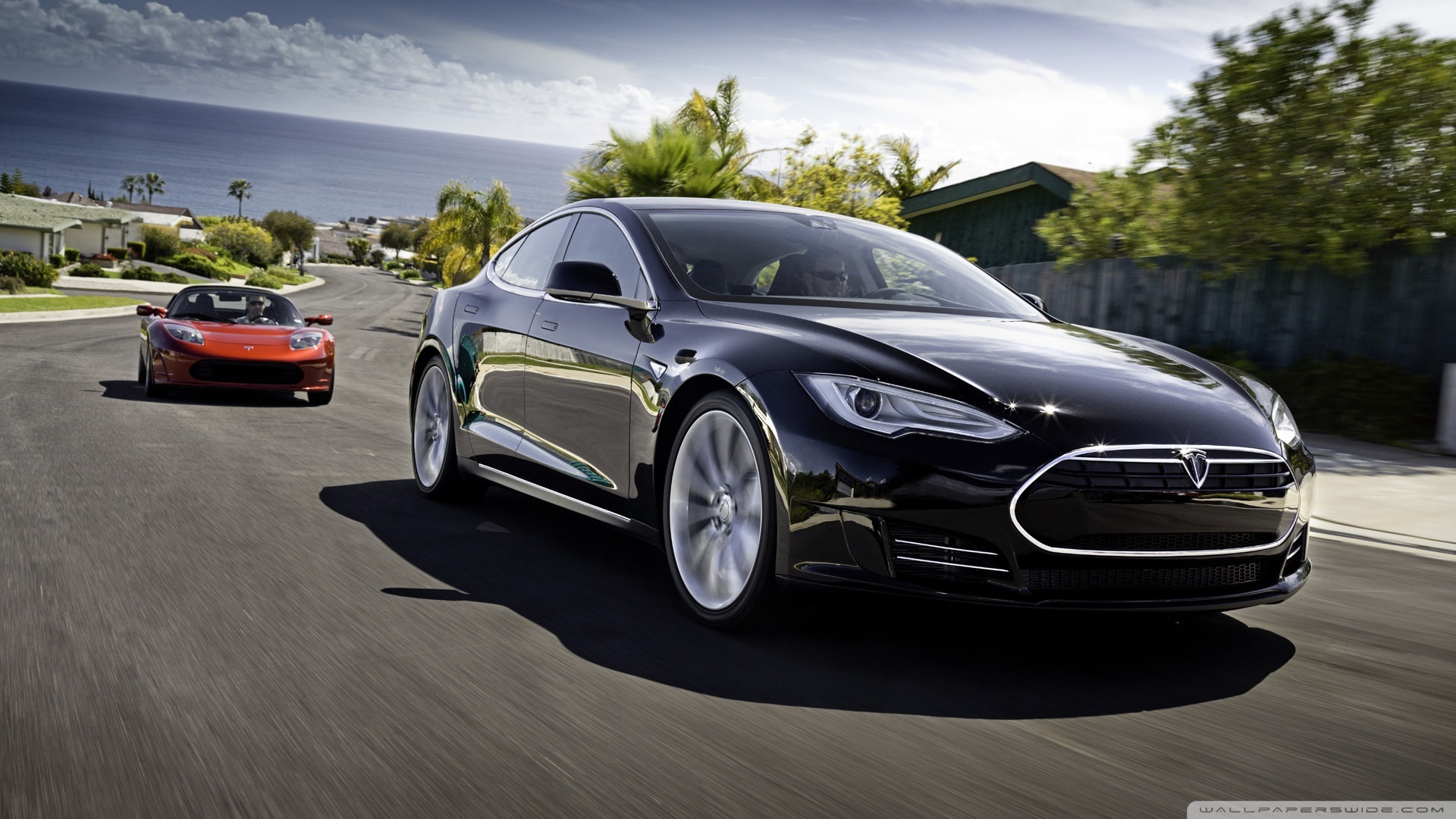 Description: Two cars driving down a road next to a house and ocean in the background with a cloudy sky above.