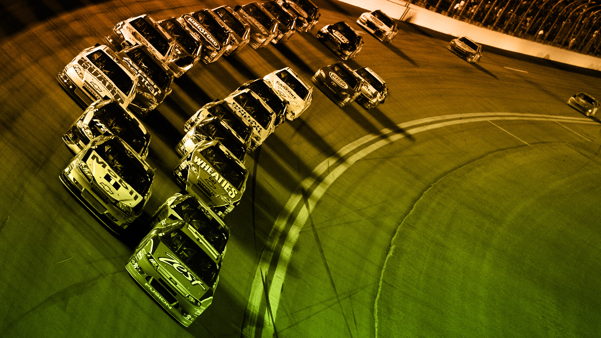 Description: A row of cars parked in a parking lot next to each other on a green carpeted area with a yellow line.