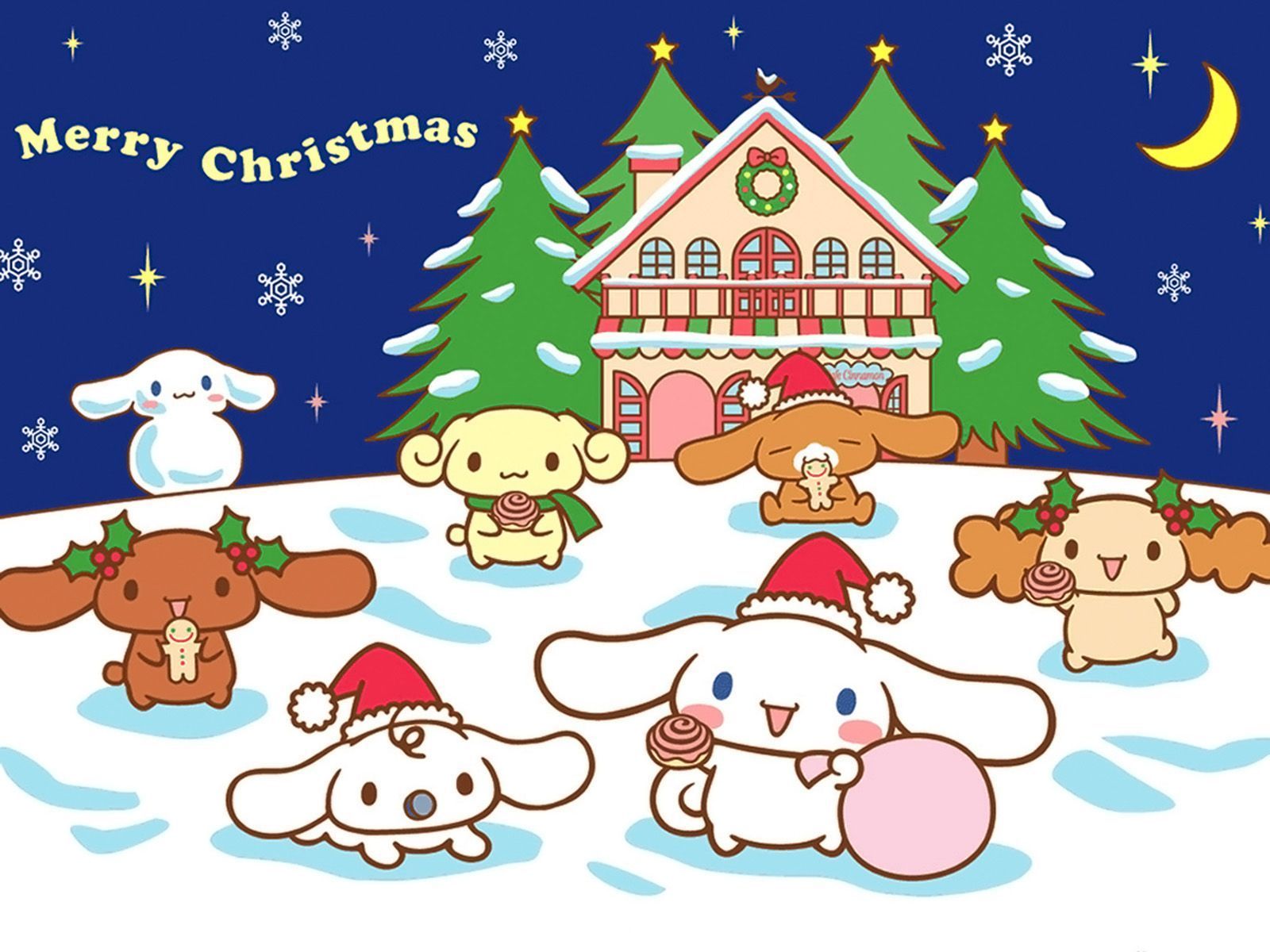 Description: A group of cartoon animals in a snowy scene with a house and trees in the background with snow falling on the ground.