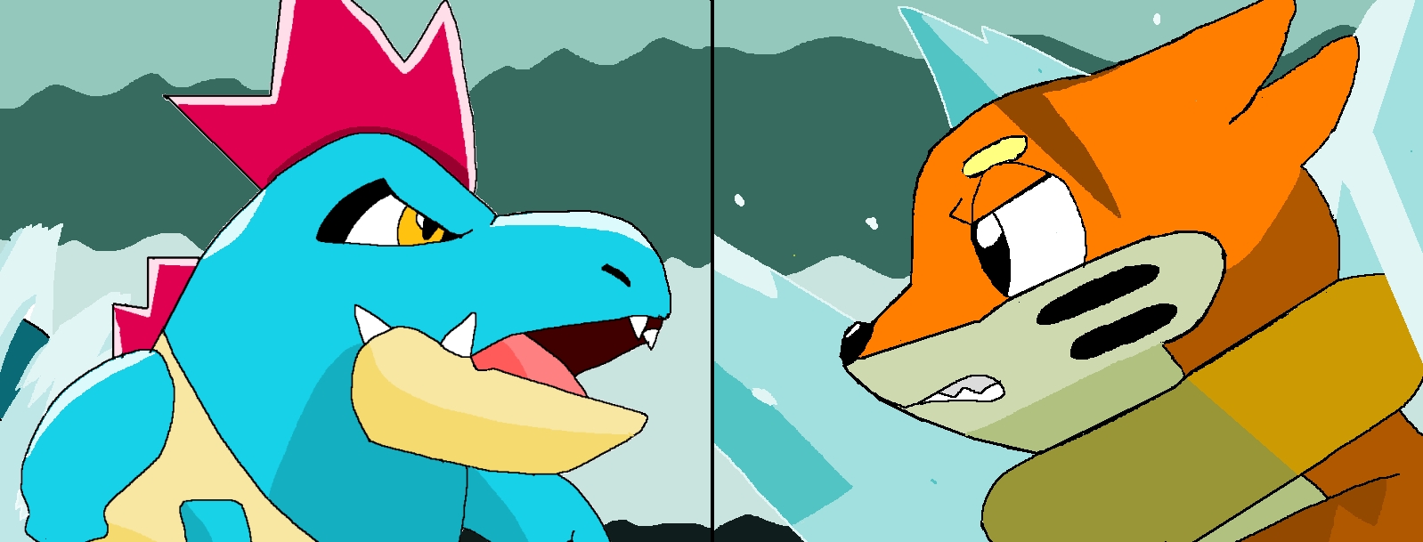 Description: A couple of cartoon animals standing next to each other on a field of grass and snow covered ground with trees.