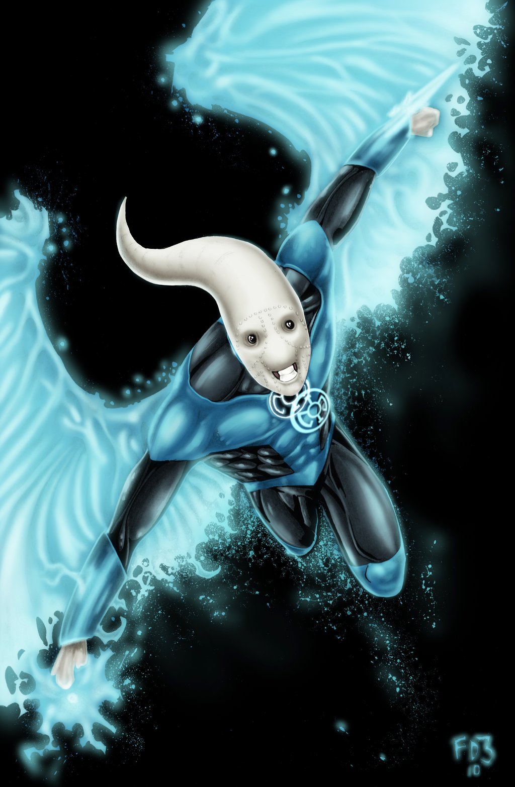 Description: A cartoon character is flying through the air with a blue background and a black background with a white cat.
