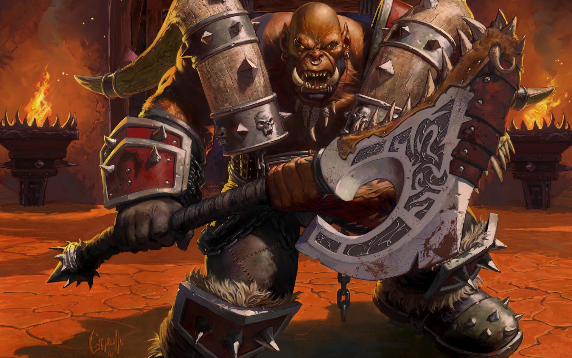 Description: A cartoon character holding a giant axe in a room with flames in the background and a demon on the floor.
