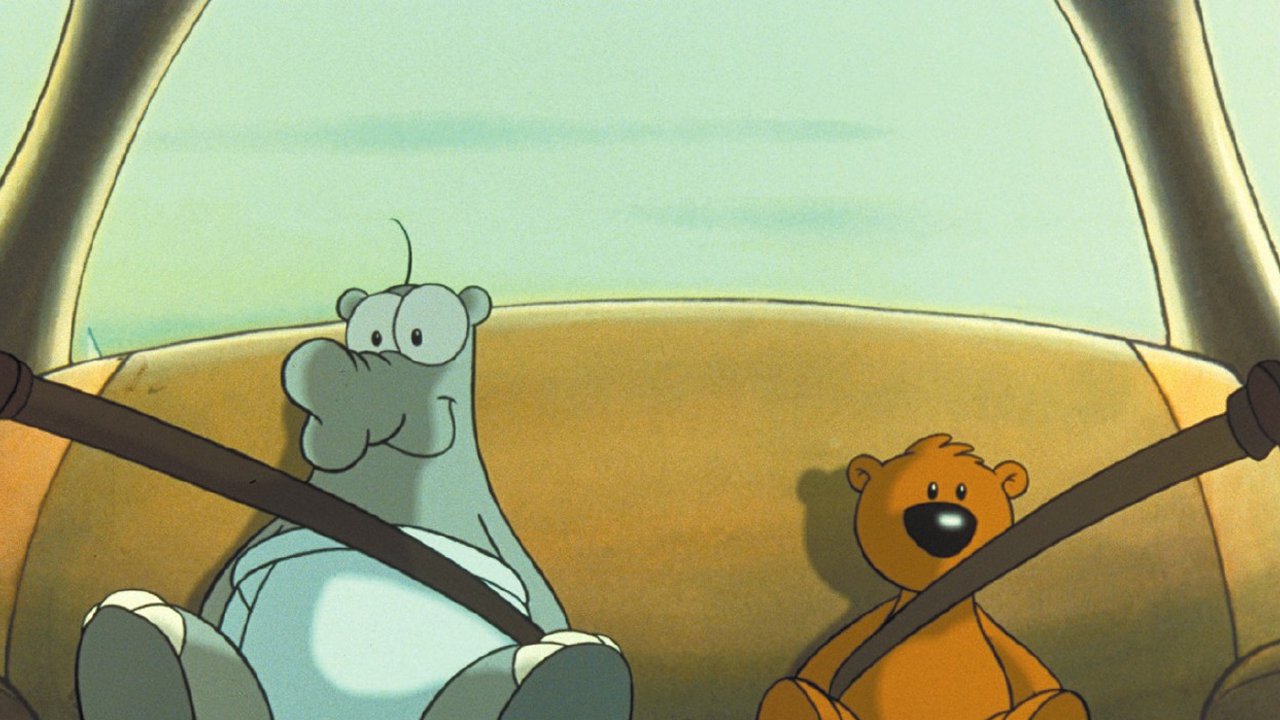 Description: A cartoon bear sitting in a car seat next to a stuffed bear on the floor of a car seat.
