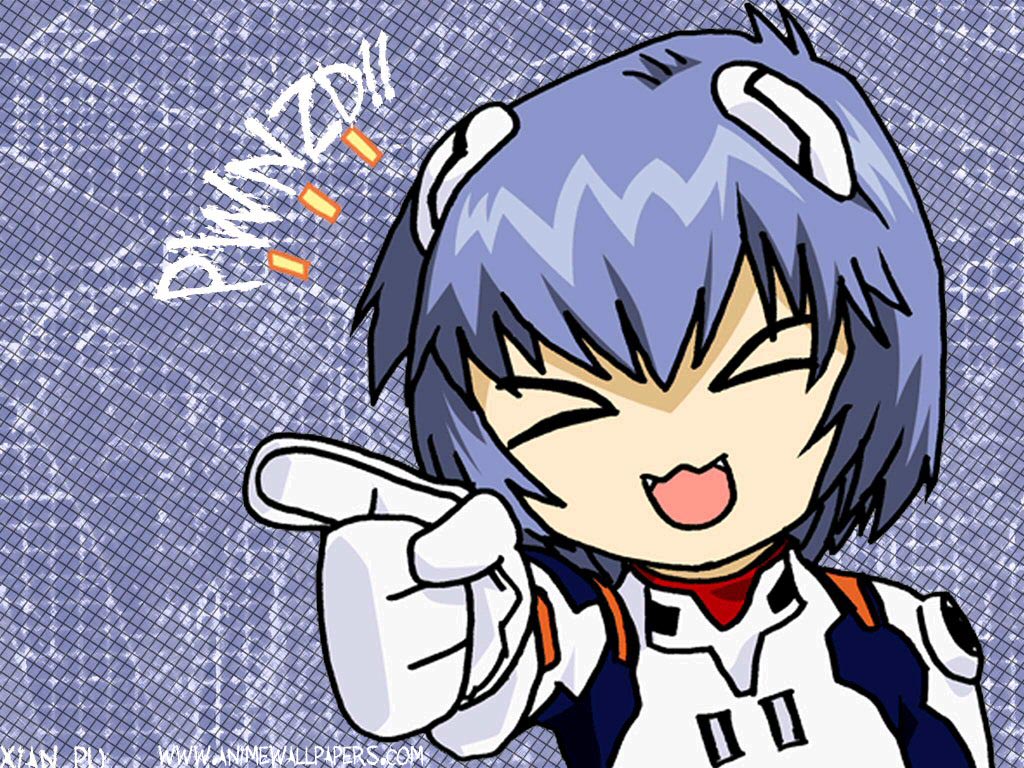 Description: A cartoon character with blue hair pointing at something with his hand and pointing at the camera with his thumb.