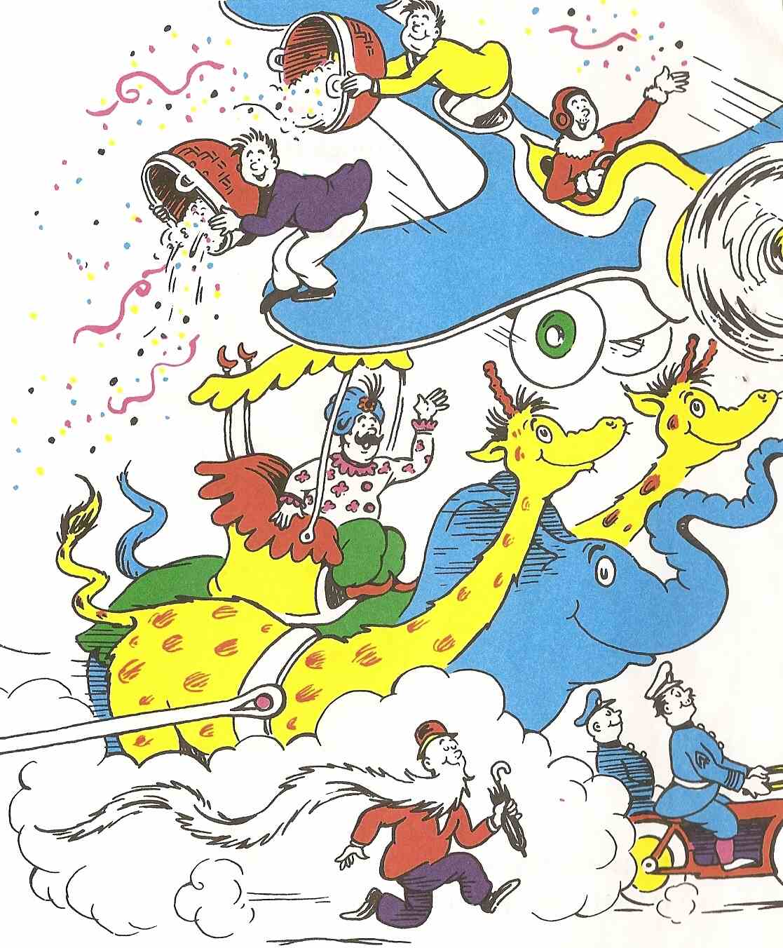 Description: A cartoon of a group of people riding on a bus with a dog on the back of it and a cat on the back of the bus.
